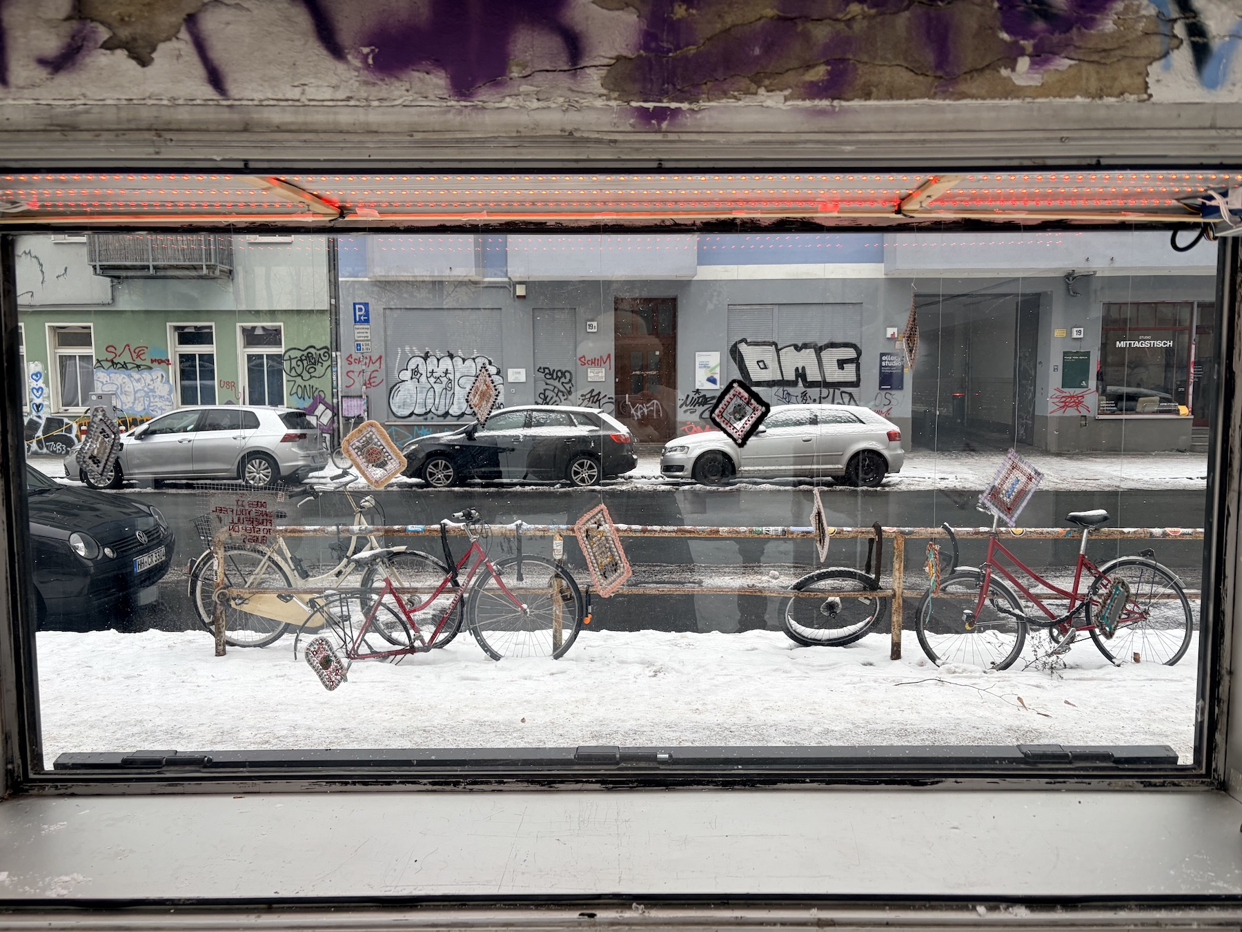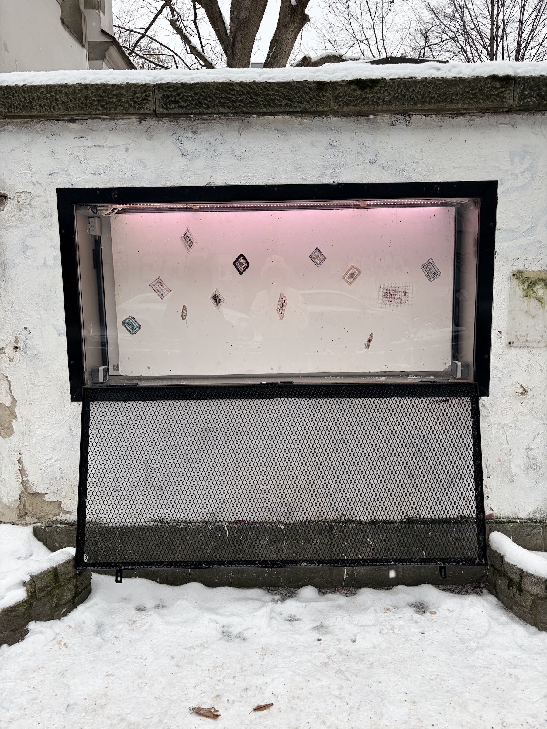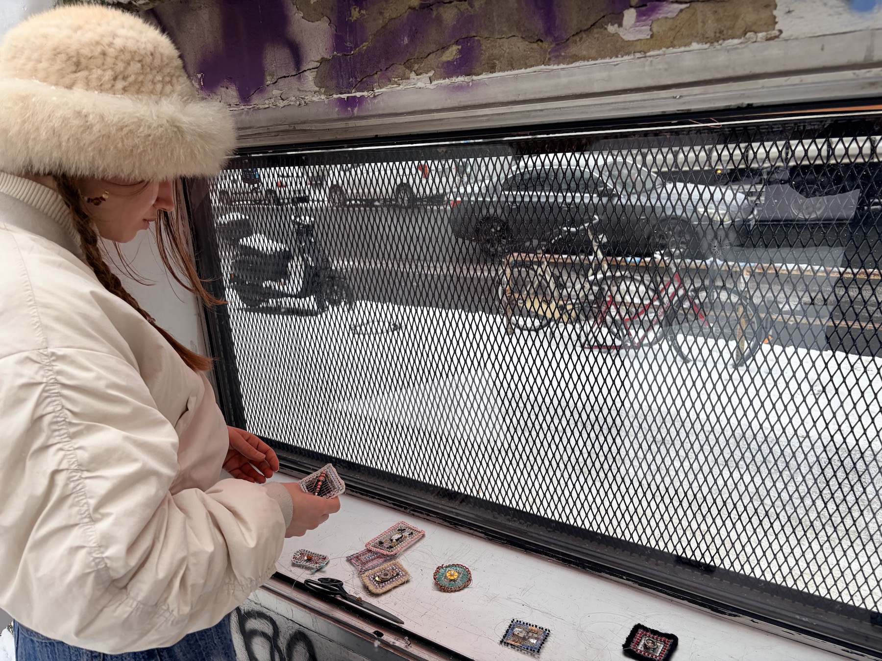 These suspended art pieces are diary entries for artist Bryn K. McConnell, documenting discoveries she made while exploring Berlin. McConnell constructed each work by weaving thread, paper, and wire into a mental grid structure. Her distinctive material language is inspired by the historic and patchwork-like construction of Berlin’s sidewalks. McConnell often collects materials while walking the city, like a magpie. Through these delicate and imperfect objects, she invites viewers to look more closely at the ground beneath their feet, to consider what came before them, and to reflect upon the impact of their footsteps.