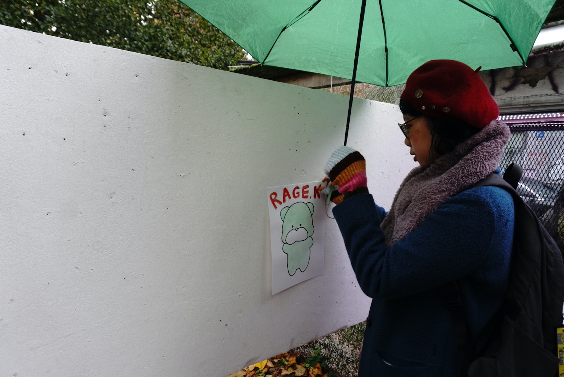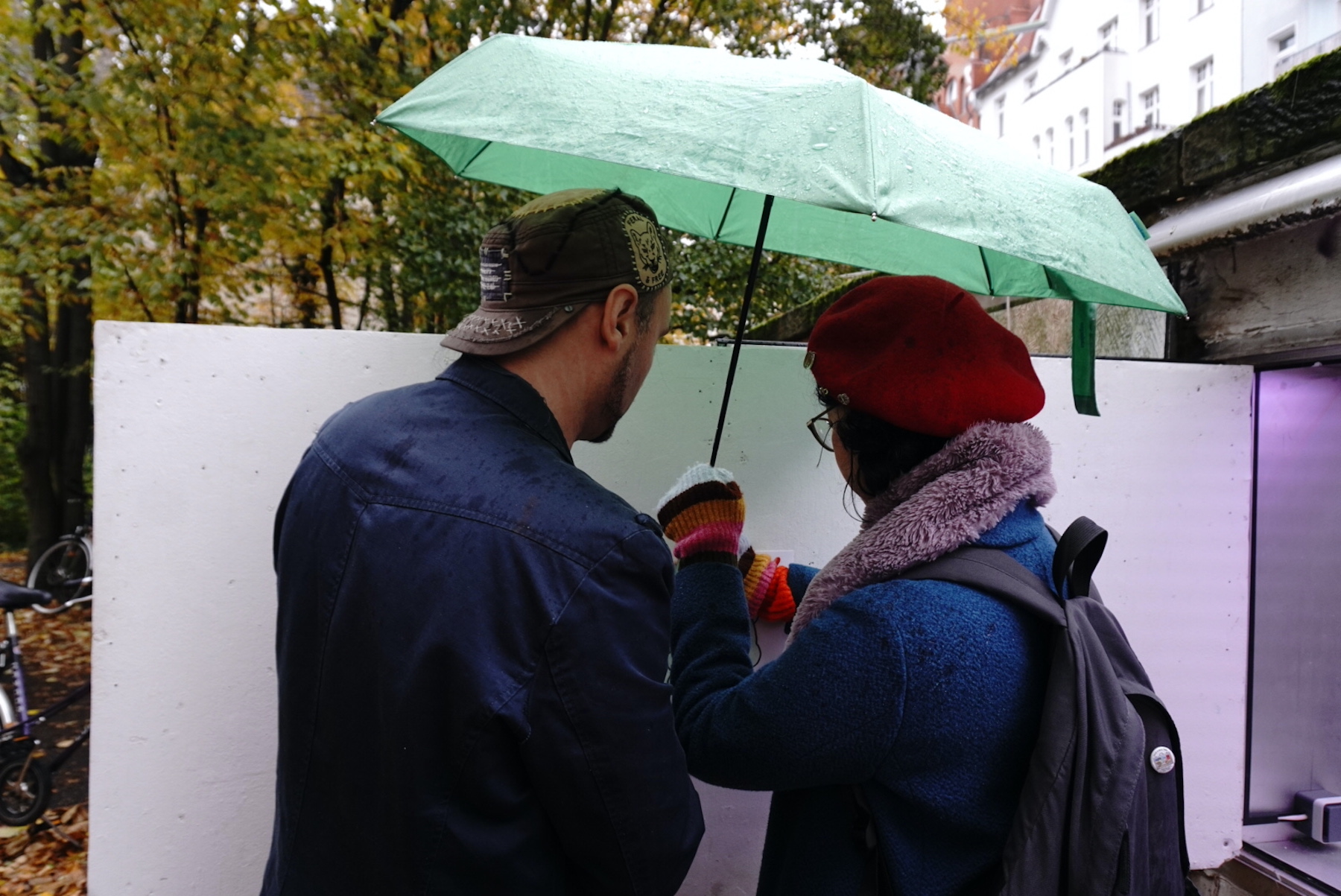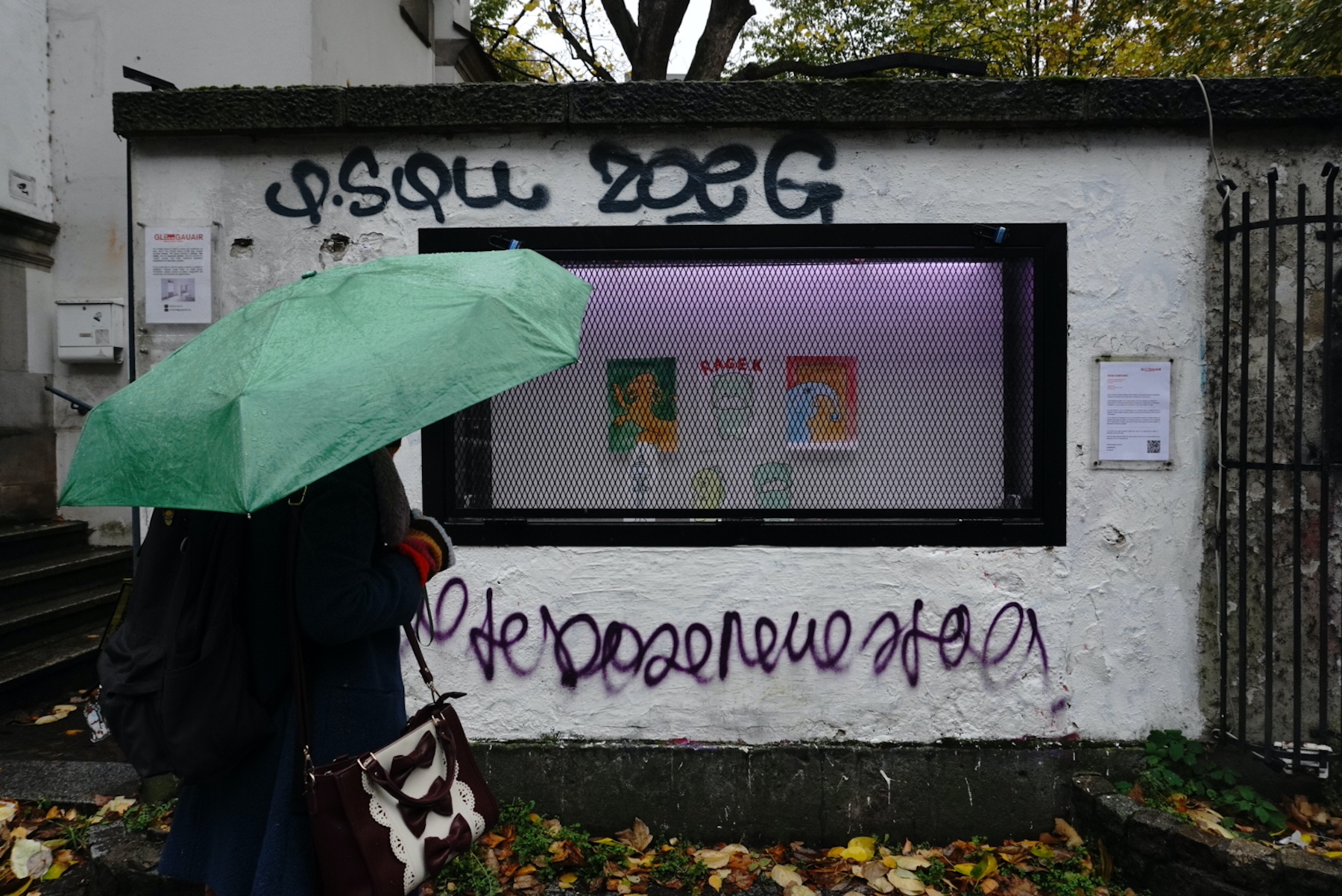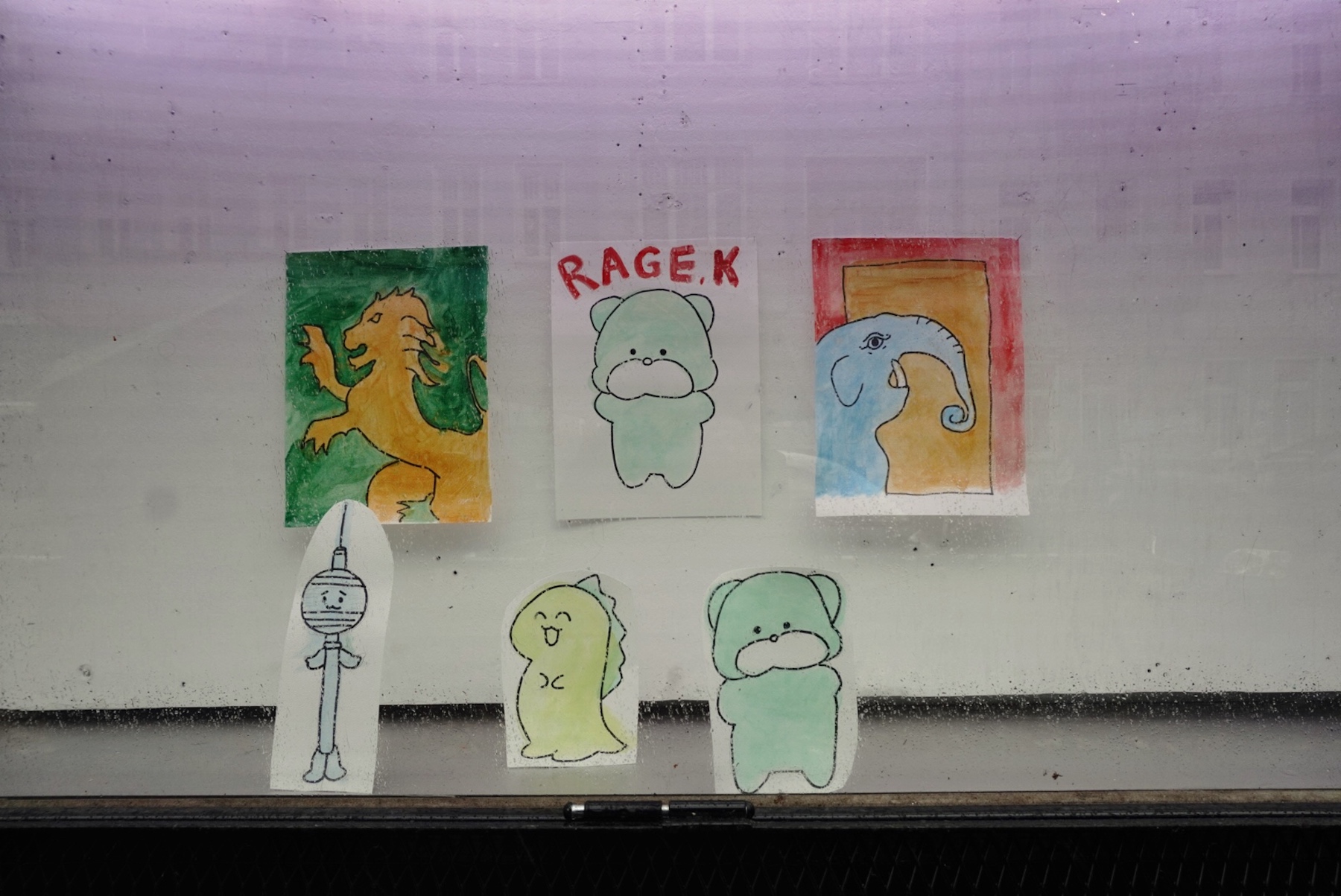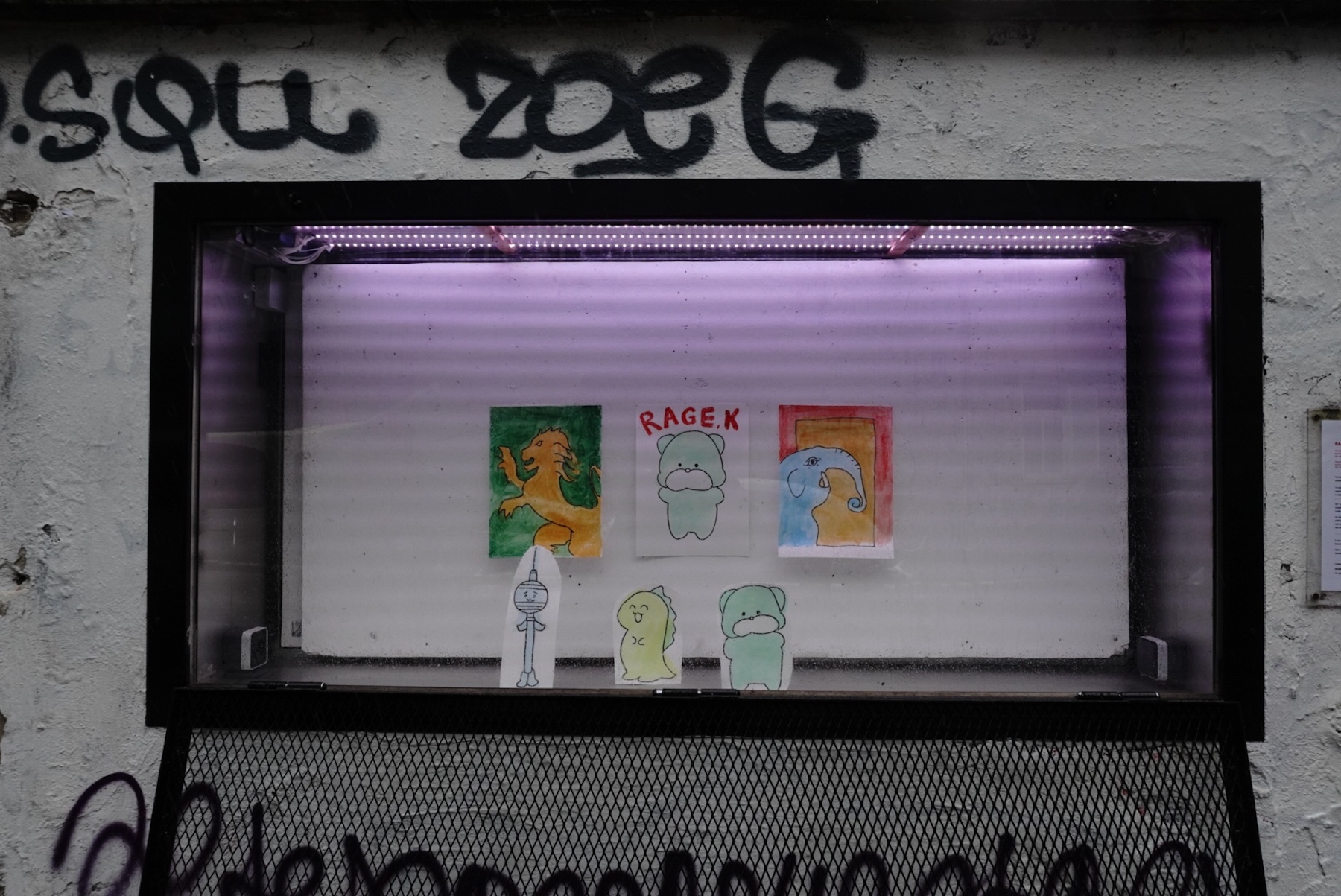 I’m also inspired by puppetry, as it’s a popular medium in the Czech Republic as a political tool against authority. The showcase setting fit well as a background for a puppet show, or a Ningyo-geki in Japanese, so I made puppets from my characters in my zine with the Berlin TV Tower.