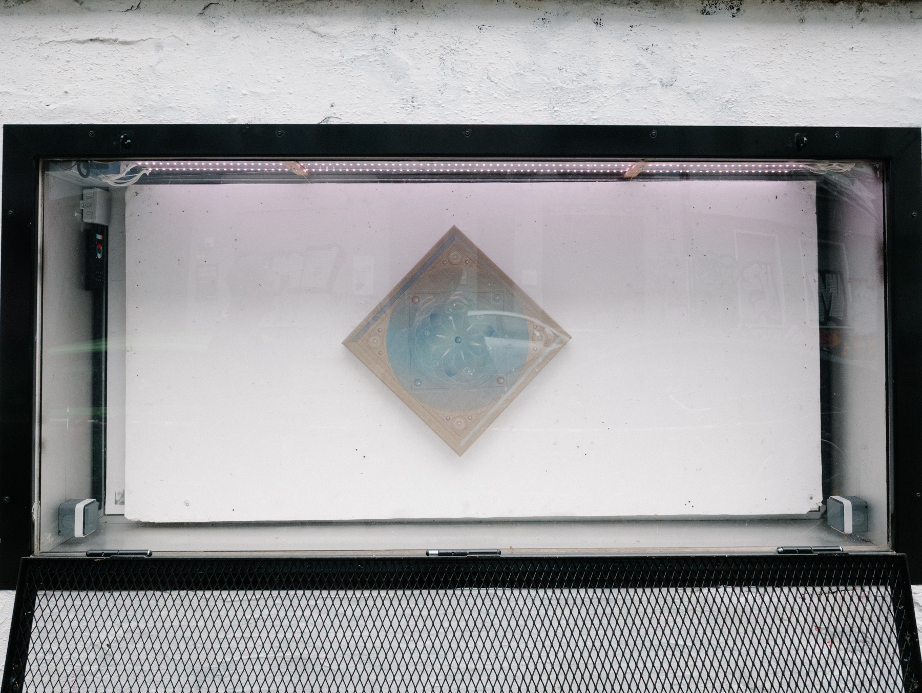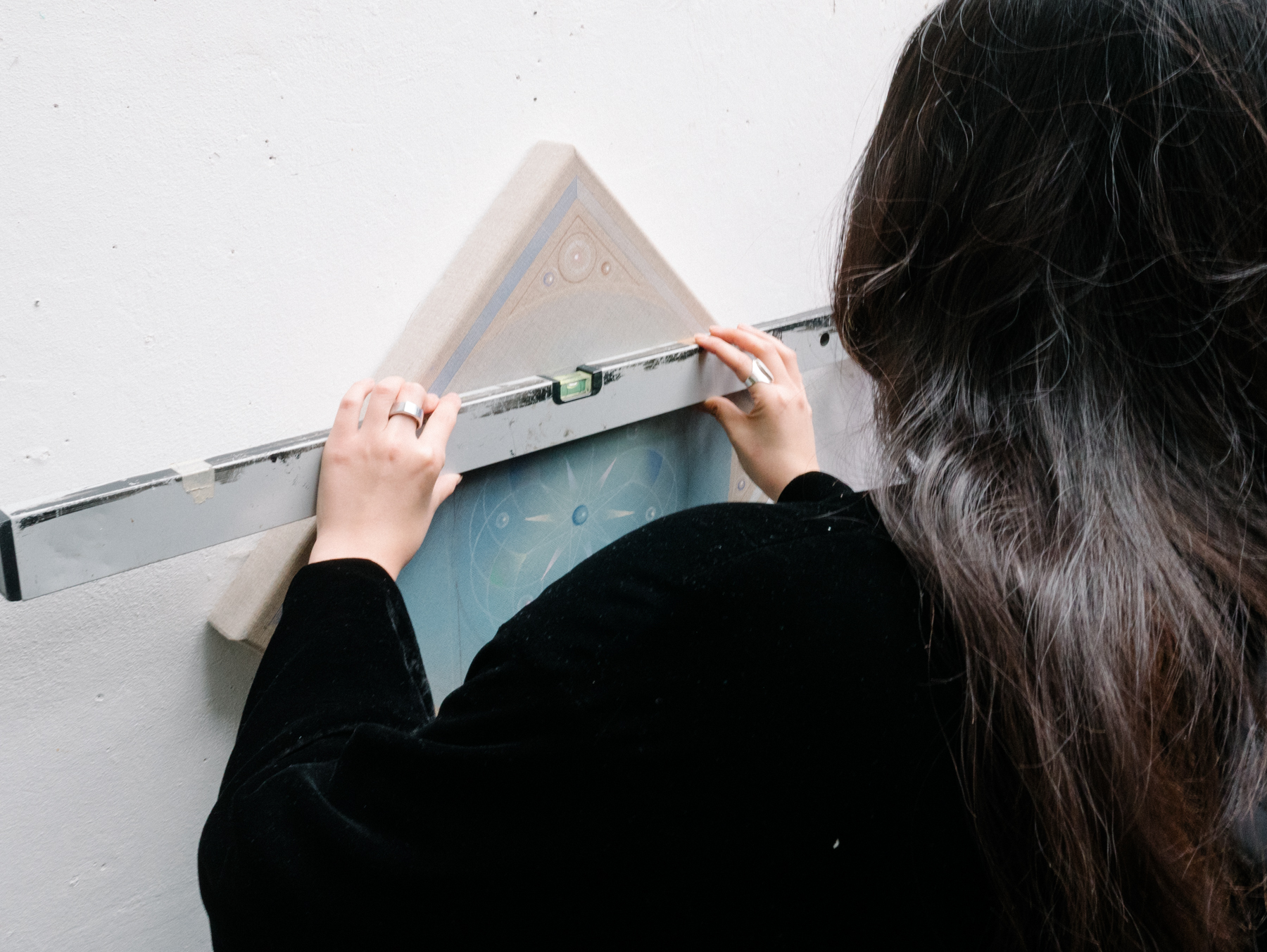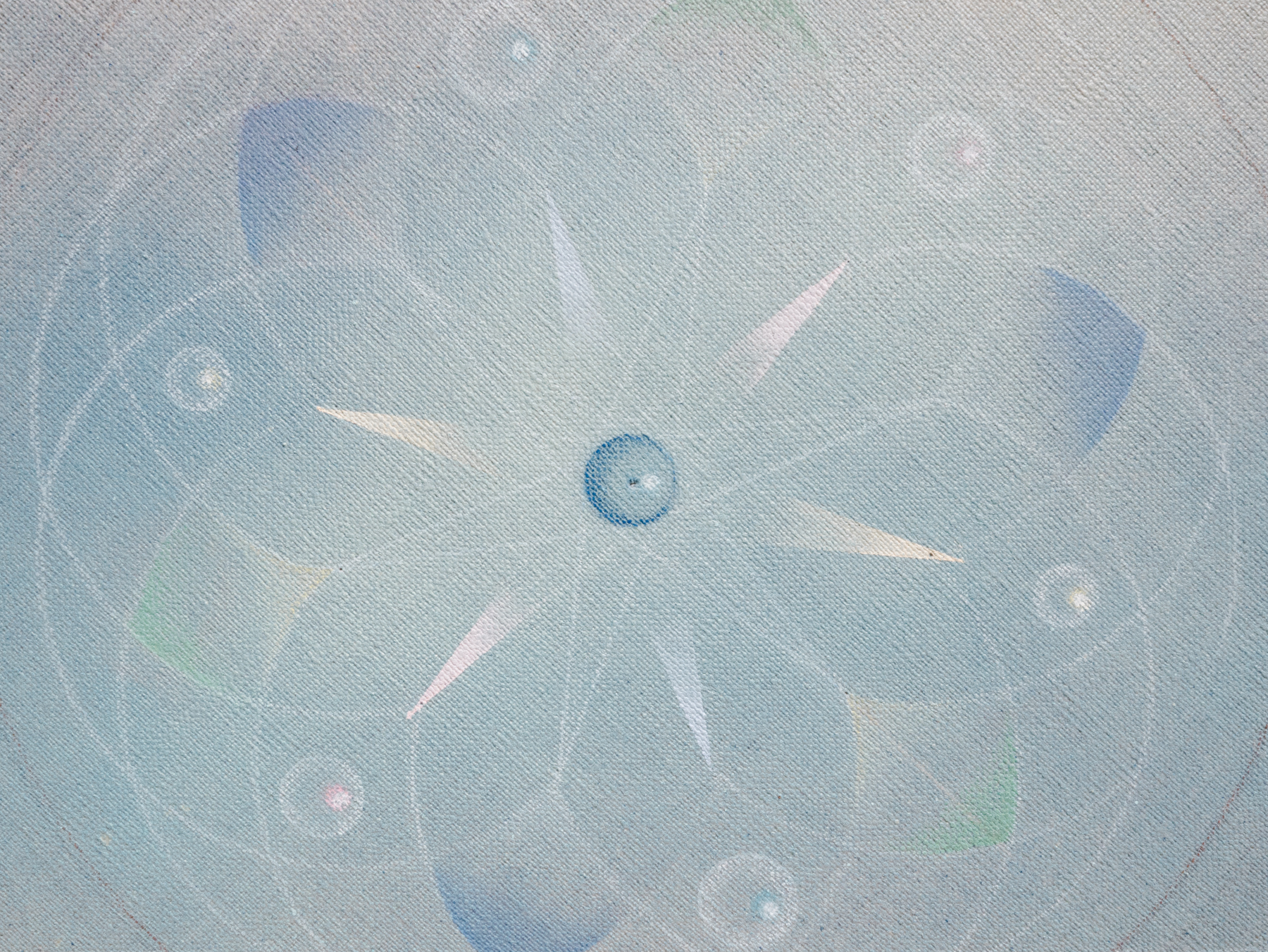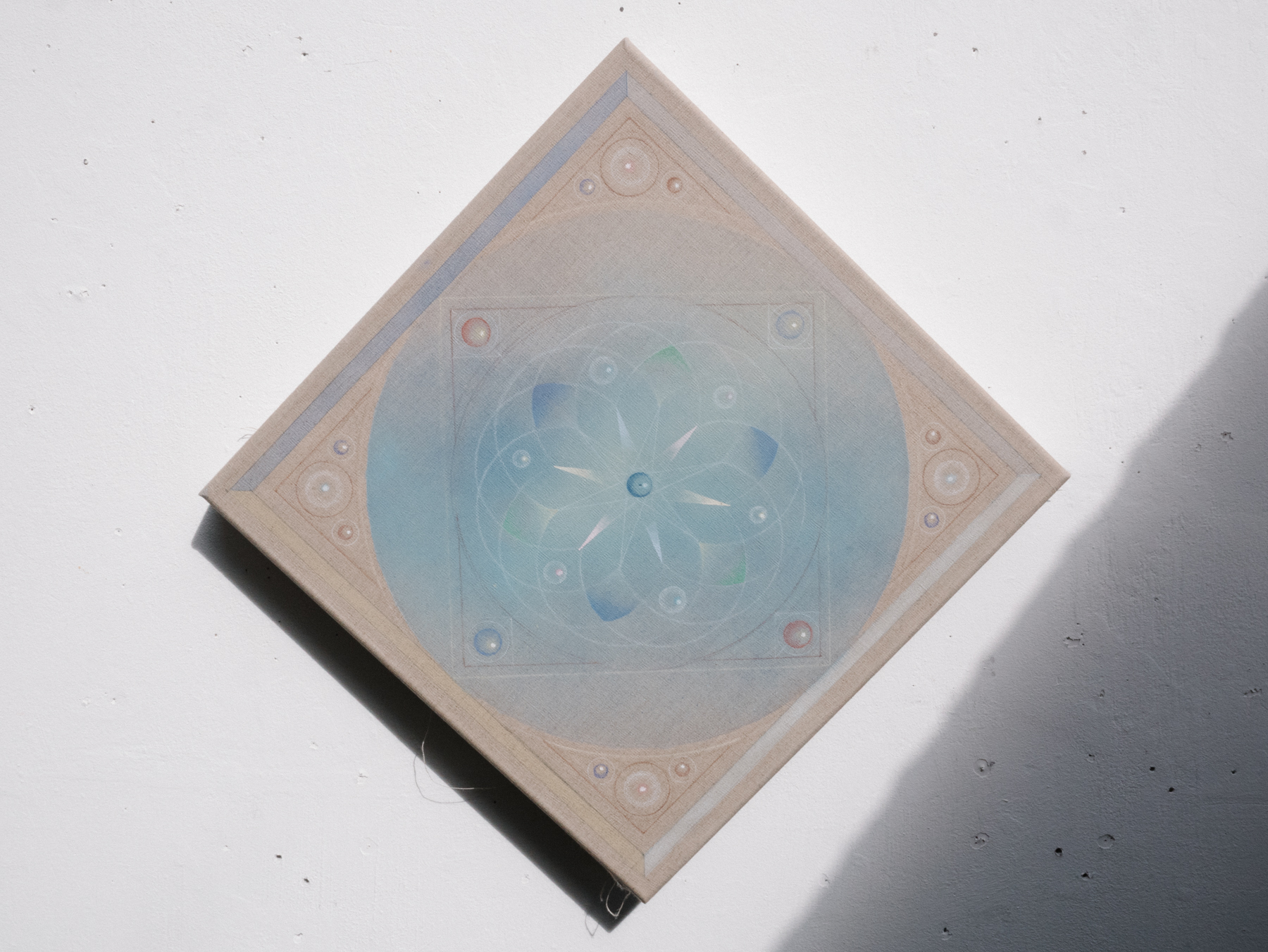 1. A mandala is a geometric configuration of symbols. In various traditions, mandalas are used as ritualistic diagrams to focus the mind and advance the spirit. 2. The term comes to mind only after the artist has set up the initial composition in the painting. 3. The artist was working on the painting during open studios on the weekend before her showcase. During open studios, the artists were expected to welcome visitors and present works instead of working on them. 4. The mandala itself draws from a mythic longing for supreme integration, and the desire to return to a pure, non-spatial, and non-temporal “center.” 5. While painting in real time during a crowded public event, the artist–usually demanding absolute solitude for concentration–was induced into a state of calm introspection. 6. No mandala is the same as another. Each one is a projected image of the psychic condition of its author. 7. The visual elements of the painting are subconsciously drawn from fragments in her studio, including: a reproduction of Jan Van Eyck’s Ghent Altarpiece, the (rare) pristine blue of Berlin sky, and the Waite Rider tarot card, Two of Swords. 8. The provided notes describe not just a mandala as a static image, but the act of creating one as a ritualistic event.