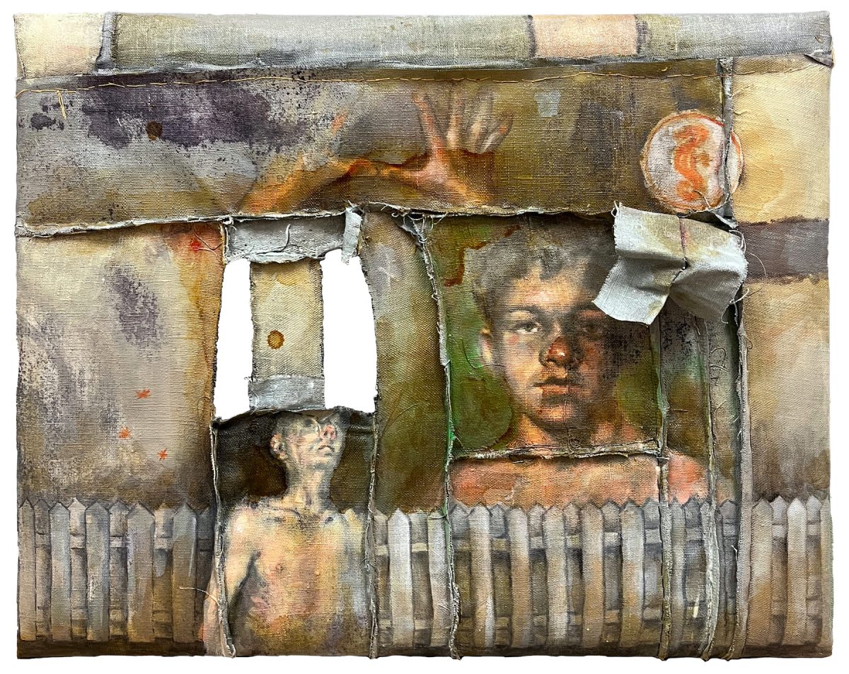 As the exhibition concludes, Arbnor Karaliti’s paintings fill the final space with portrayals of human interaction and co-existence. In “Long time no see”, there is a comfort inherent within this exact co-existence, yet still a potential discomfort —two people, instead of interacting with each other, gaze coldly out at the viewer and pose, as if you have just entered their space without permission. After breaking away from one’s life in solitude, where reflection and daydreaming are more valued, one is forced to reconsider how space can be either tainted or influenced by the presence of another.