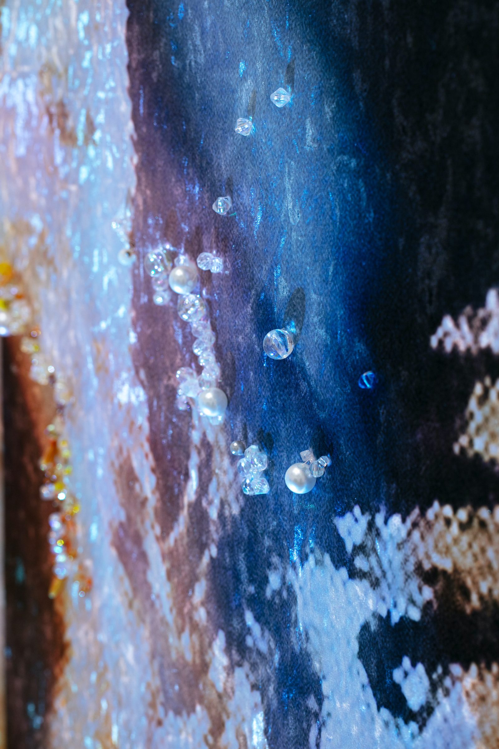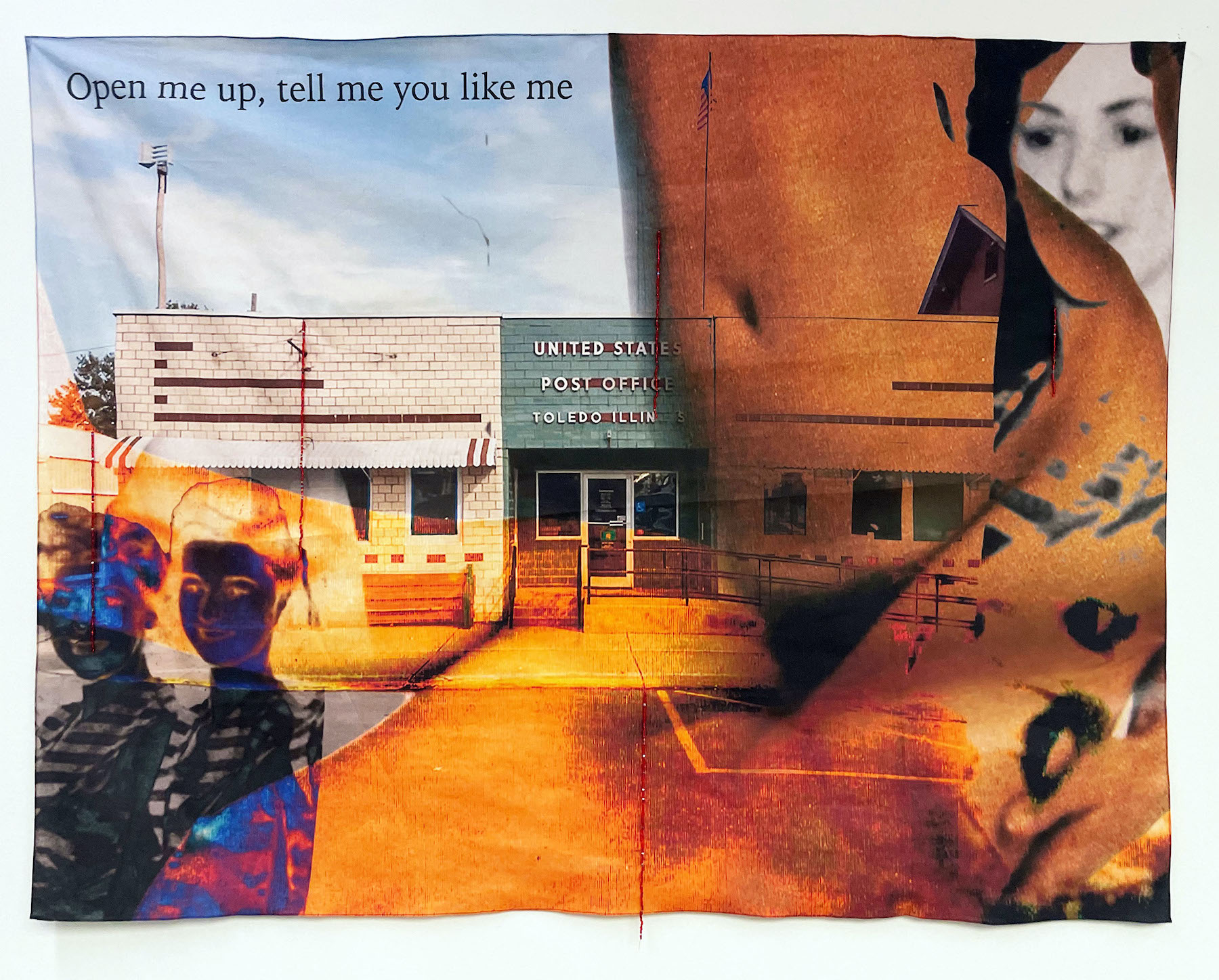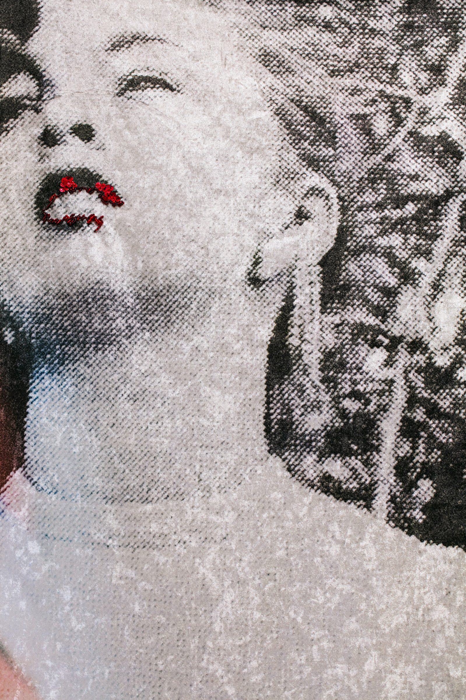 I interrogate trans and non-binary femme representation through fiber art, new media, and collage techniques. Sourcing material from sensationalized, often disposable media like tabloids, erotic ephemera, direct-to-video VHS films, I transform the subjects depicted therein into precious treasures. My process ensures that every interaction with my subjects’ visages is made with the utmost intention. Thoughtfully choosing and placing photographs, fabrics, and embellishments are acts of resistance. The care involved in such repetitious activities is a defiant rebuke of the idea that there are those inherently unworthy of existing.