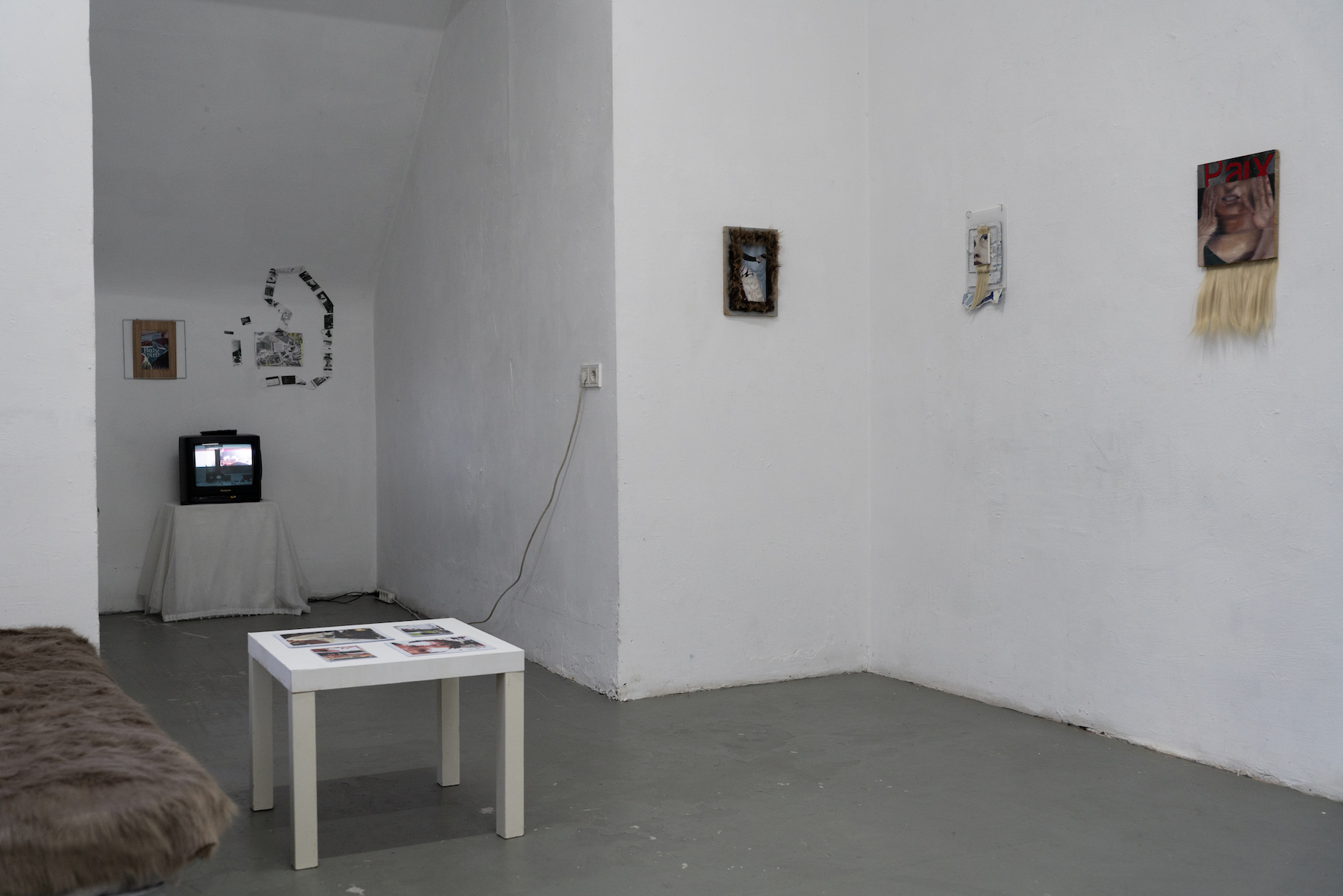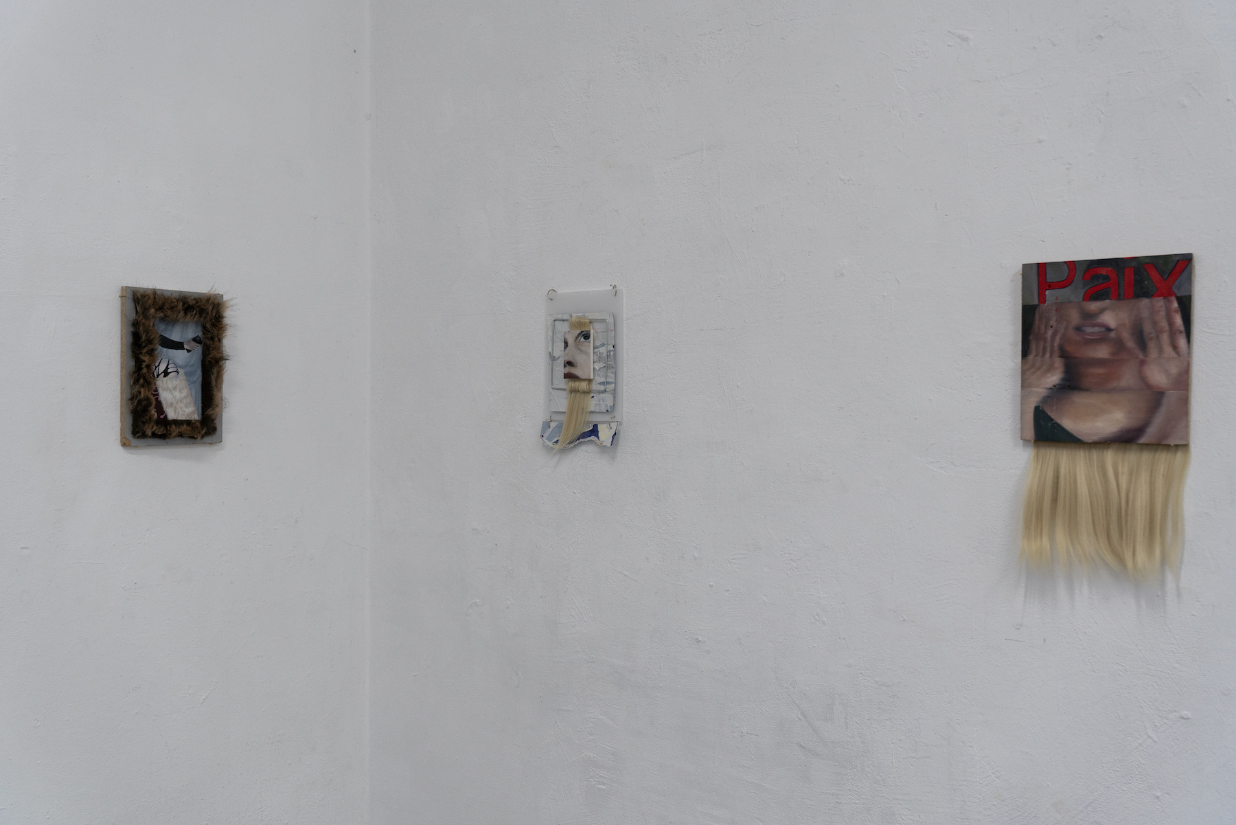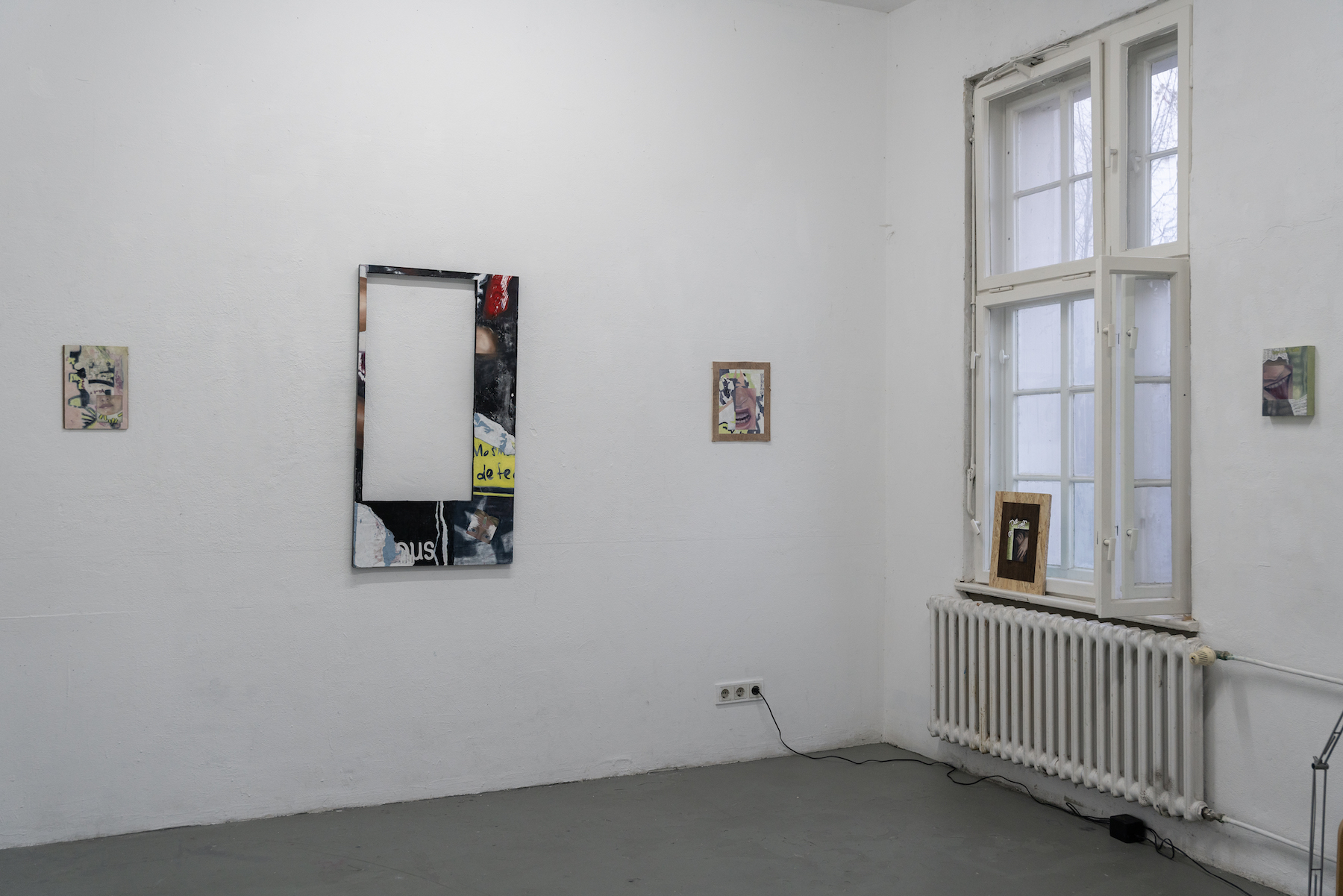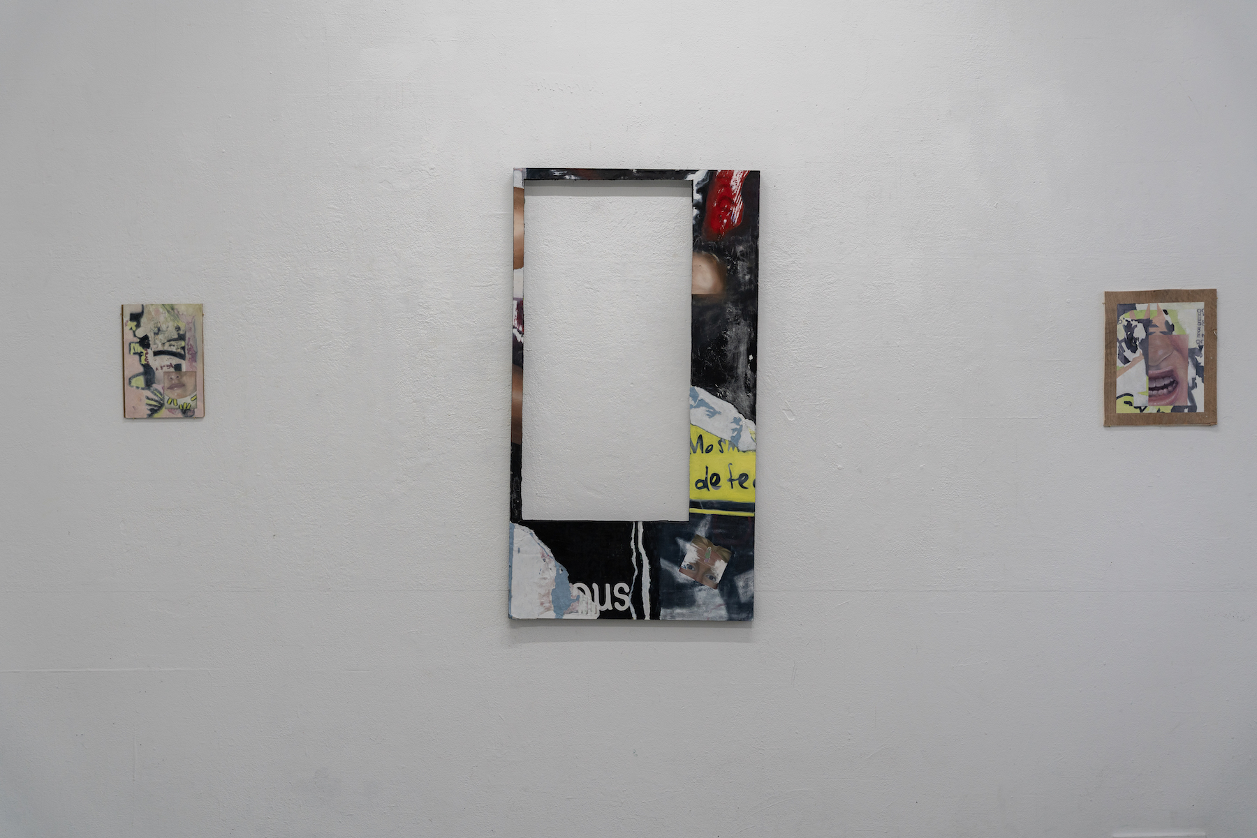 James is interested in our need to express and locate ourselves within a wider social fabric. She sees fragments, discarded objects, decontextualised images, street posters, and digital leftovers as shared expressions rather than isolated statements about our individual lives. Using methods such as image transfer, collage, digital manipulation, and painting, she merges materials collected through both analogue and digital processes. These include found wooden panels, salvaged street posters, discarded photos, receipt-printer outputs, digital scans, and oil paint. Through this hybrid approach, James builds textured surfaces that operate as living archives.