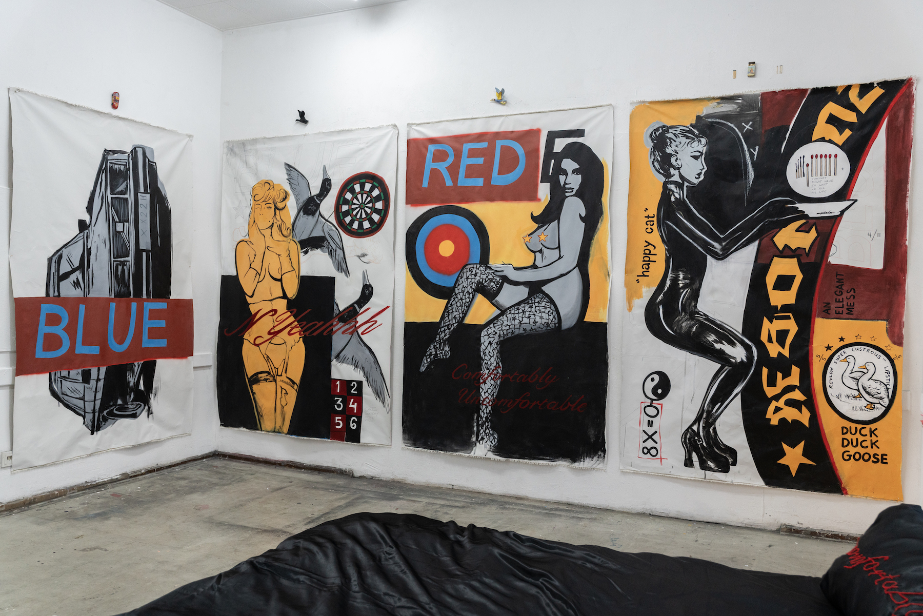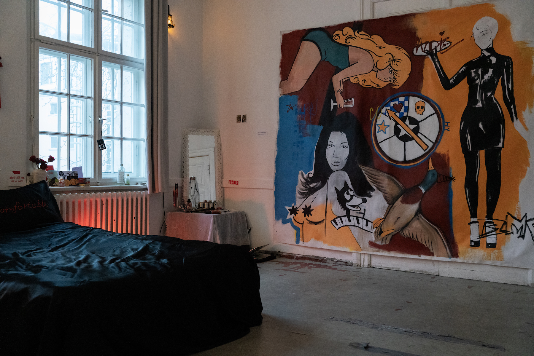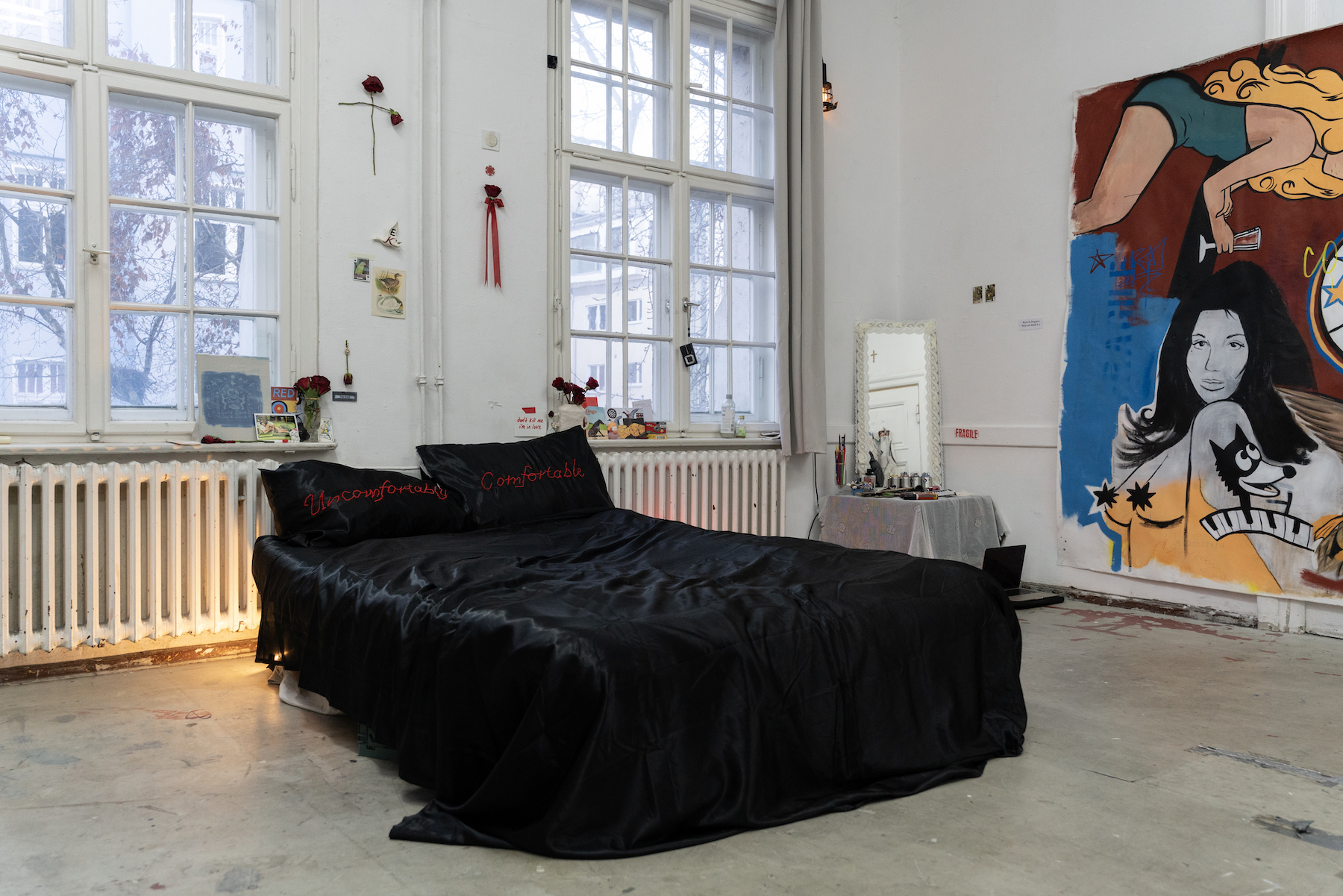 During this residency, McCue has been exploring Berlin, a journey reflected throughout her large-scale paintings. Immersed in the city’s nightlife and urban energy, the works absorb its rhythm, freedom, and seductiveness. Many of the paintings were imagined while lying in bed in the studio, in that liminal space between night and morning where thoughts drift and images rearrange themselves. As a result, the compositions are designed to be viewed in both portrait and horizontal orientations, mirroring this shifting, dreamlike perception.
