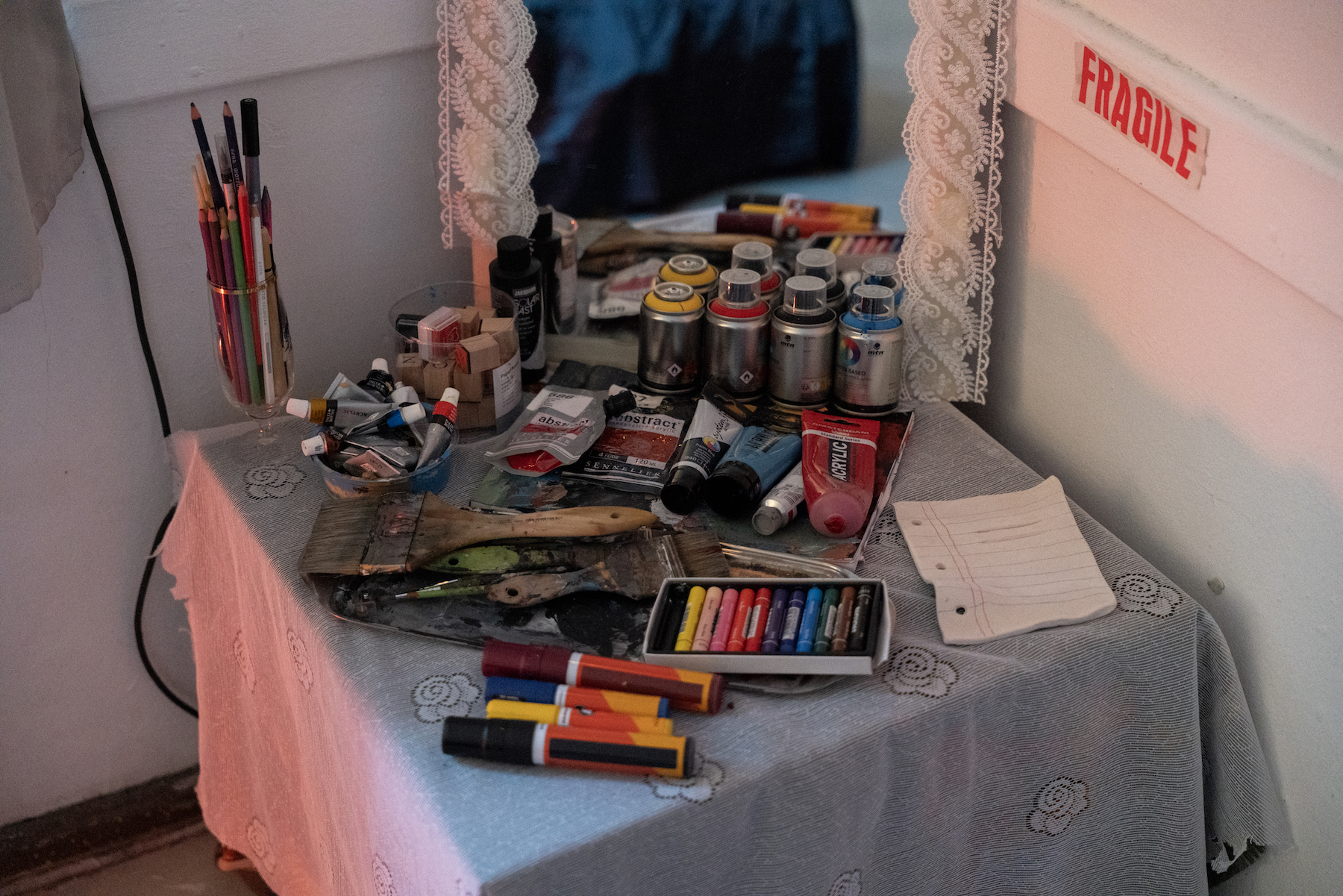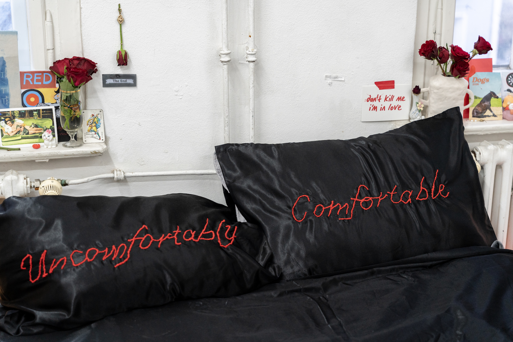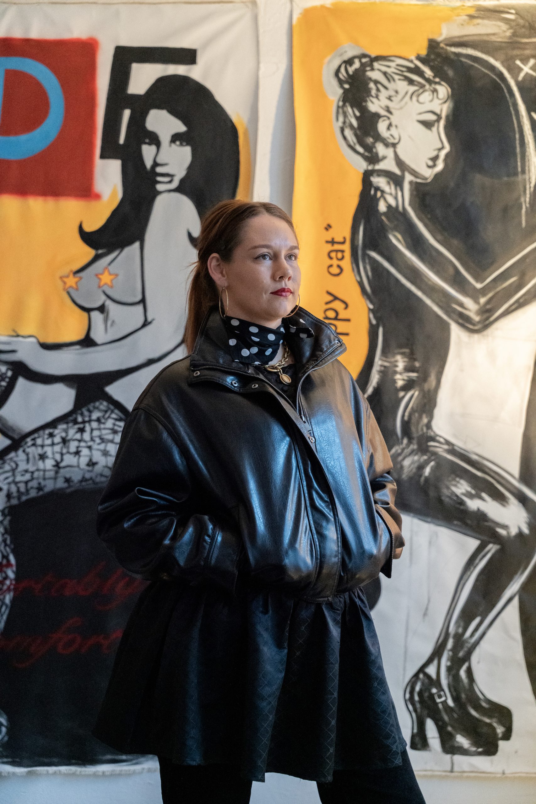 During this residency, McCue has been exploring Berlin, a journey reflected throughout her large-scale paintings. Immersed in the city’s nightlife and urban energy, the works absorb its rhythm, freedom, and seductiveness. Many of the paintings were imagined while lying in bed in the studio, in that liminal space between night and morning where thoughts drift and images rearrange themselves. As a result, the compositions are designed to be viewed in both portrait and horizontal orientations, mirroring this shifting, dreamlike perception.