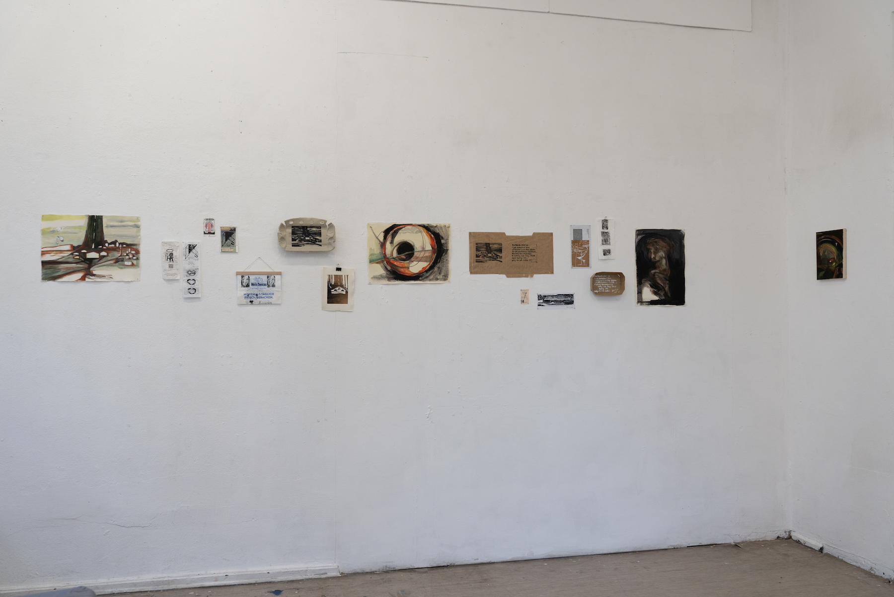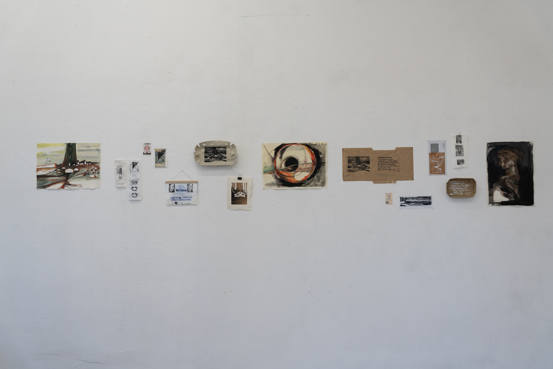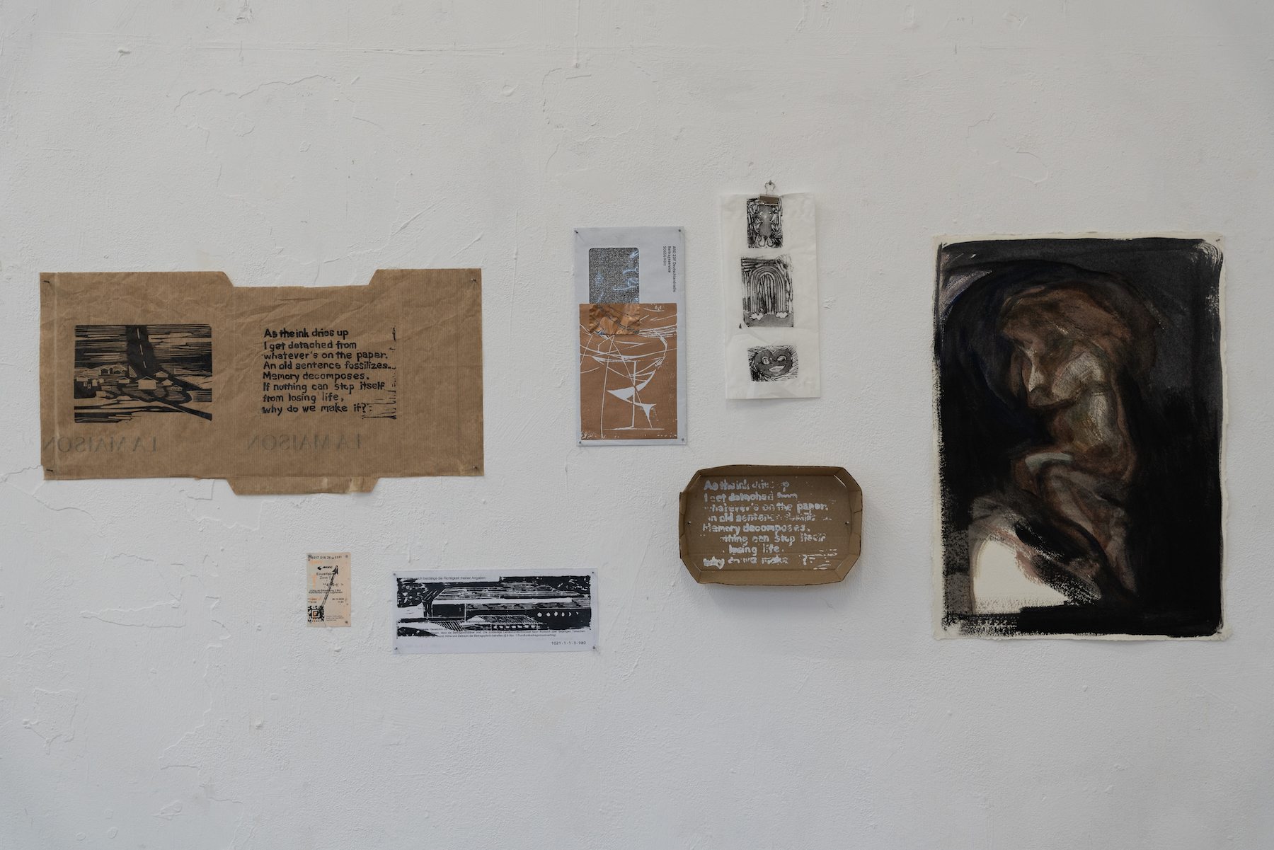 Following her last term in GlogauAIR, where she had worked with a fresh impression of Berlin, she now focuses on the routines she has adapted to within the surroundings. Through daily walks and tasks, she observes the city through a more intimate lens for visual inspiration. These impressions are then carved into linoleum plates in small sizes, so that they can be used casually or even playfully. As small-scale of the carving leaves the details rather crude, it compresses her sensory experience and simplifies it into visual symbols. They are printed on scraps of paper, from everyday items like tickets and bakery packages to others such as surcharge bills and notes taken for job applications that allude to practical struggles.