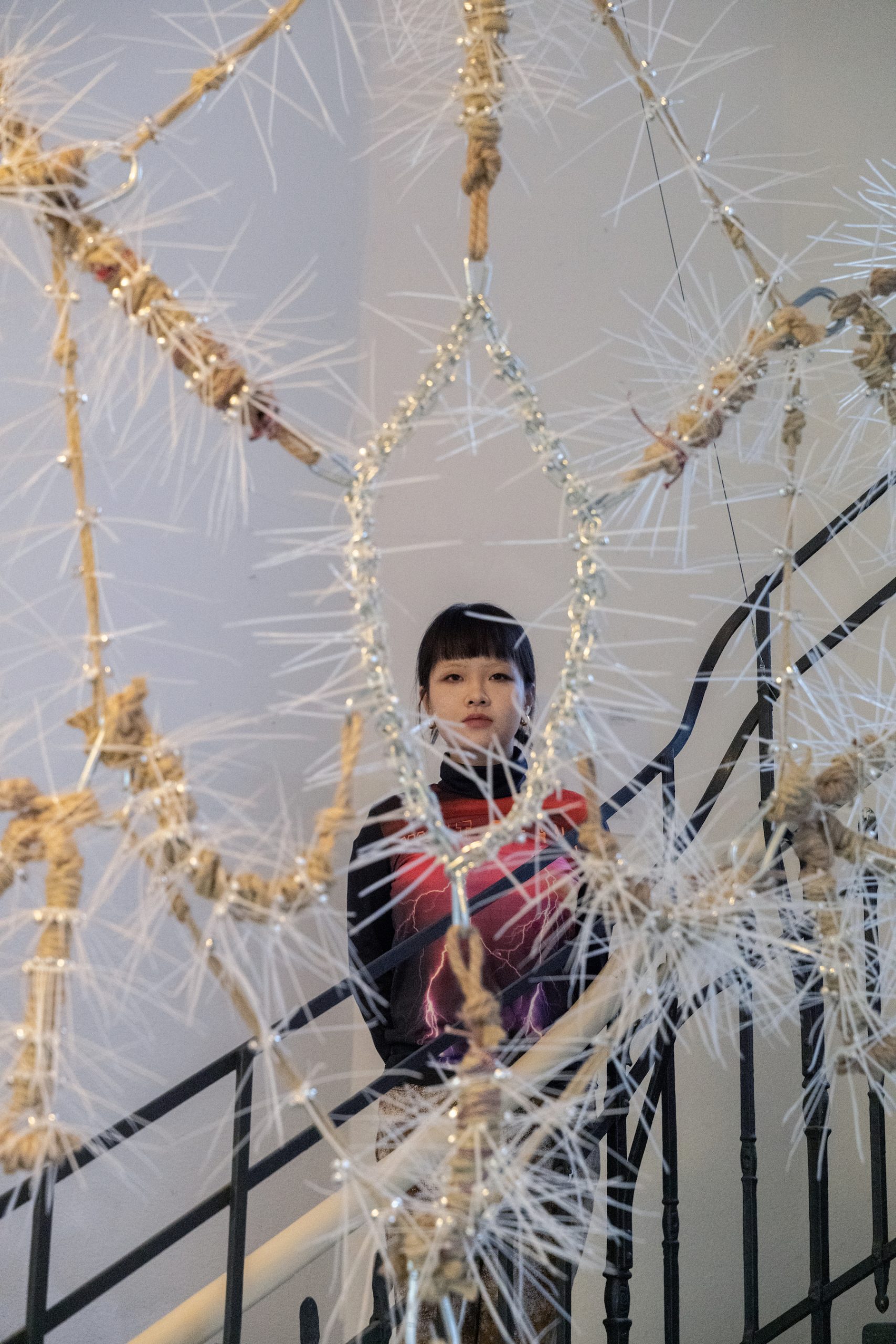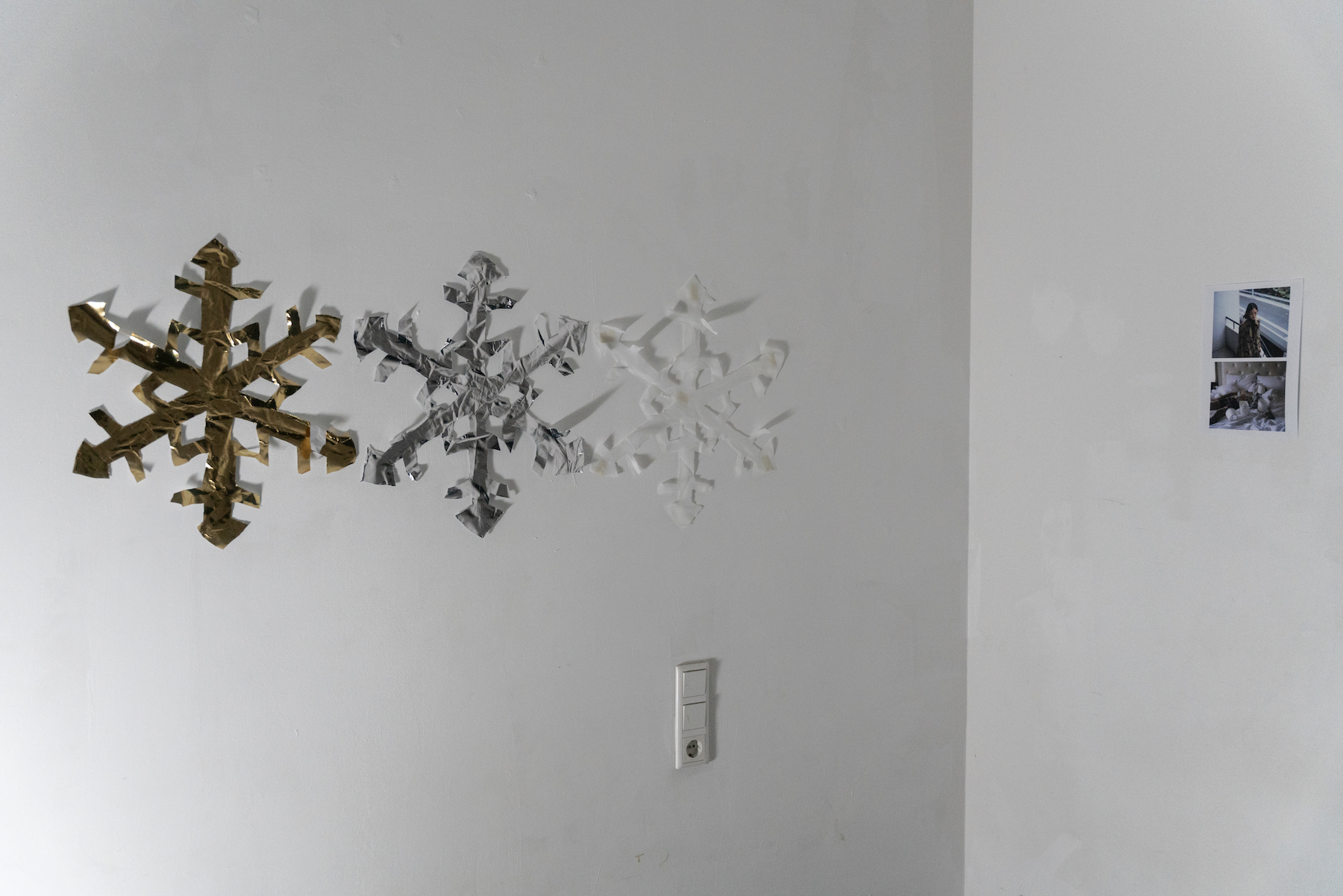 In Berlin, she extends Hanging Study by transforming logistical materials into snowflake-like assemblages that act as both installation and instrument. These modular structures reflect on systems of support and the poetics of suspension, turning industrial circulation into a site of sensorial inquiry. In parallel, she develops a film-fiction project inspired by Walter Benjamin’s Berlin Childhood, reimagining the city’s history through drifting recollection and fictional encounters.