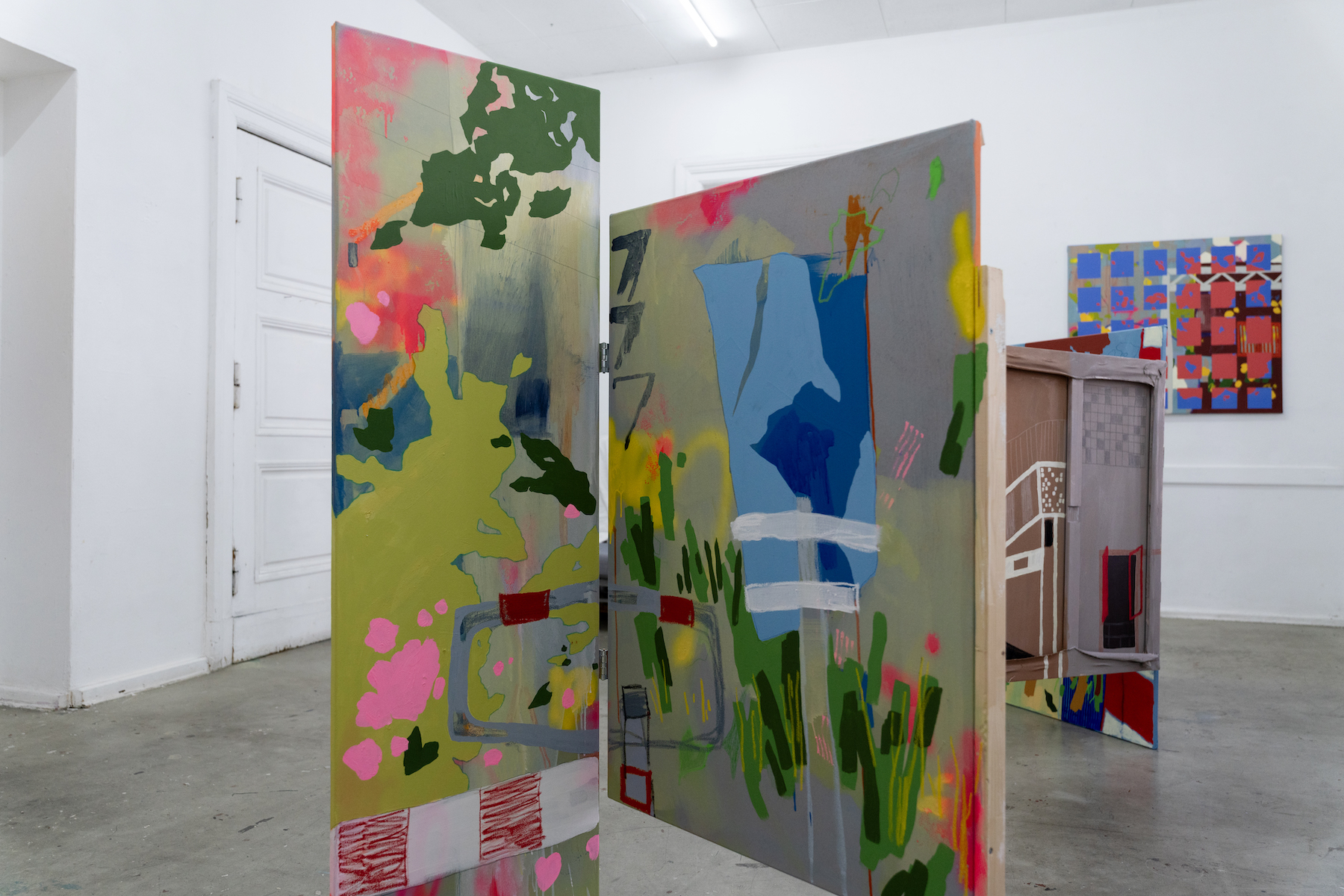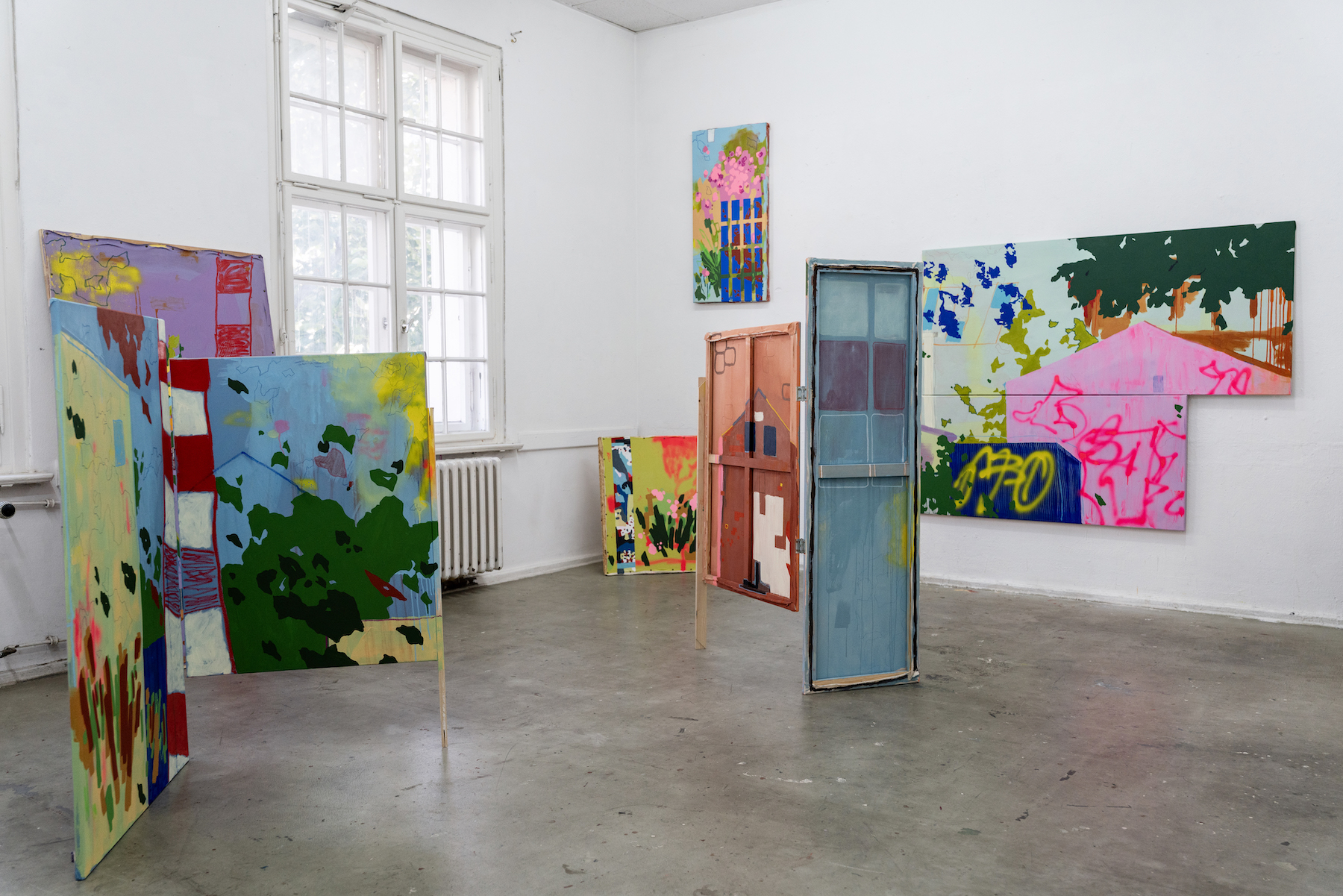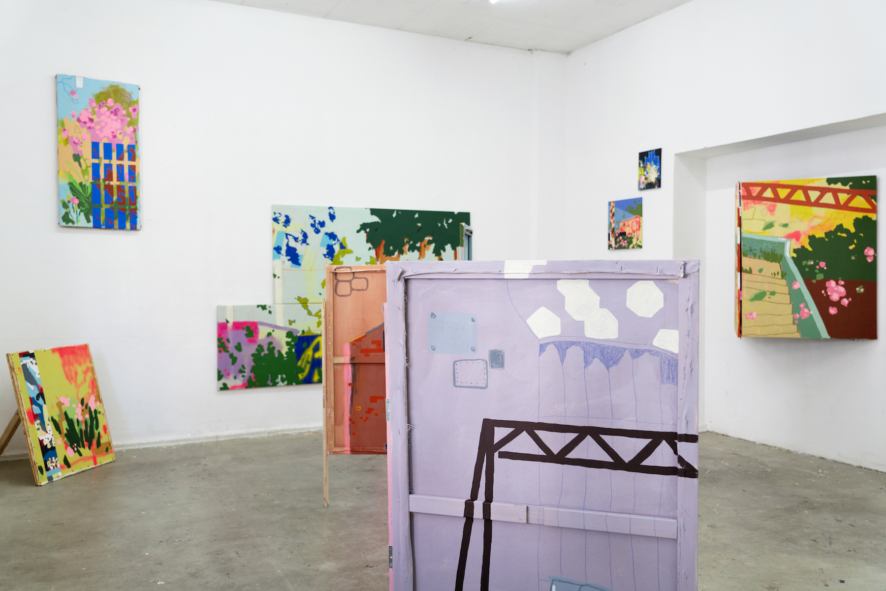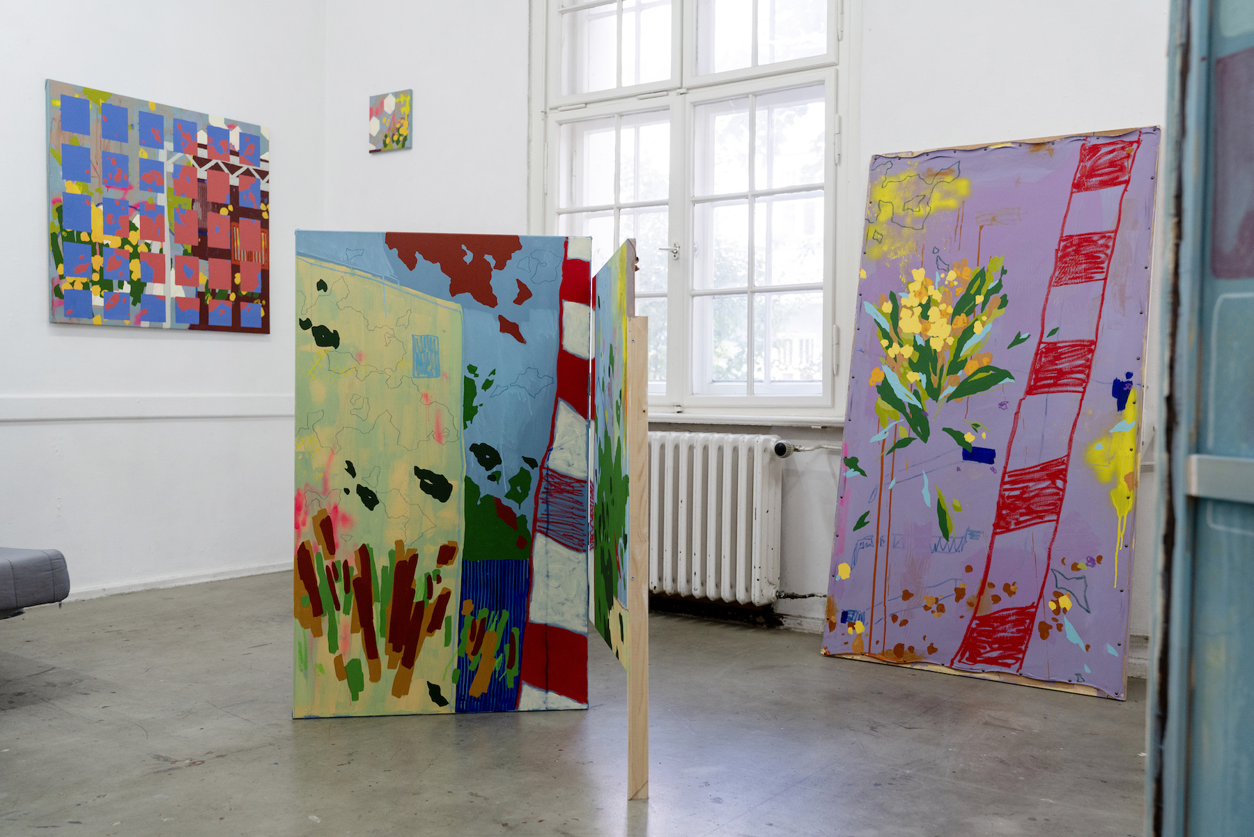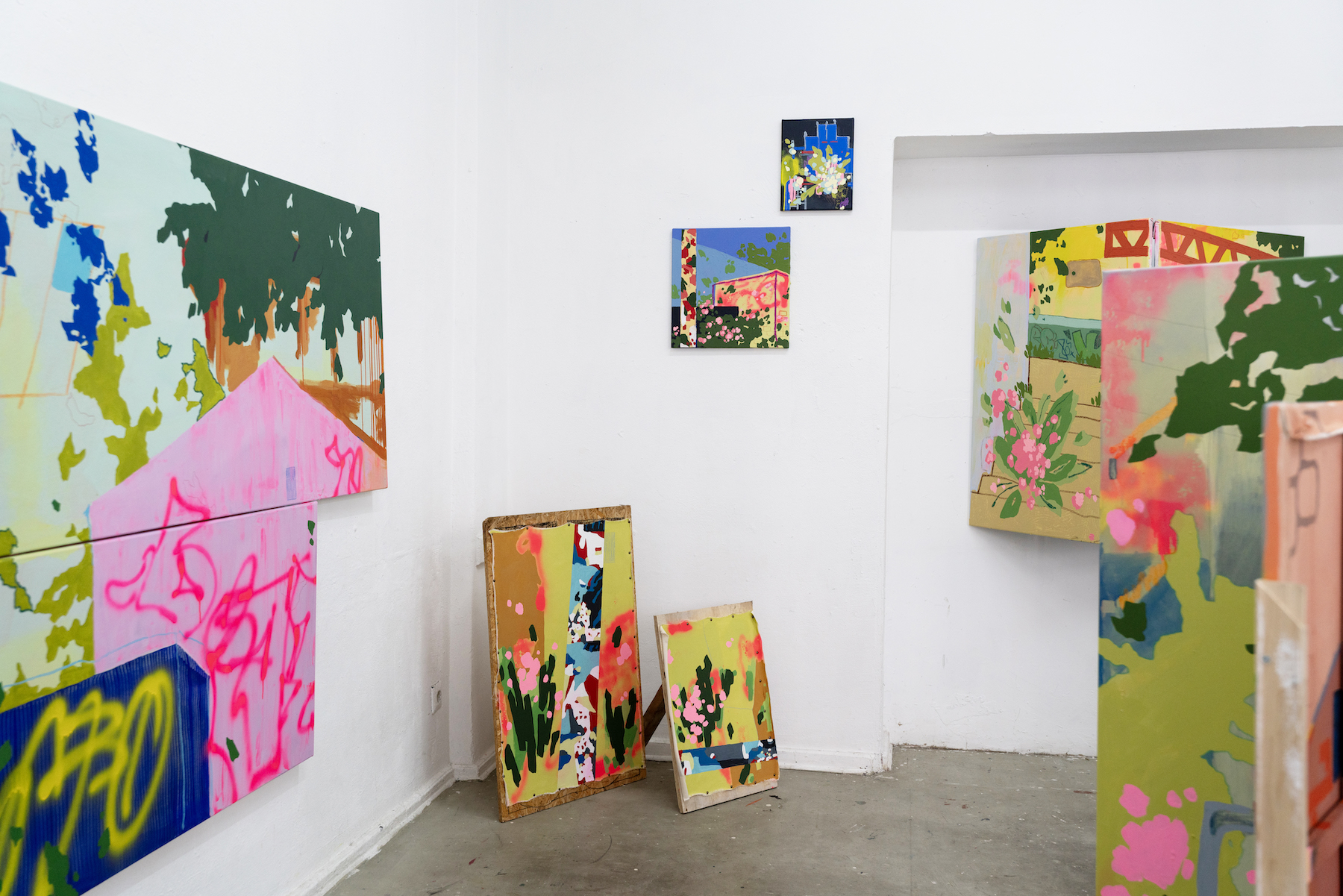 Her current project at GlogauAIR focuses on the quiet persistence of the organic amidst the brutality of city life. It meditates on how nature reclaims space and reasserts itself, even in inhospitable environments. She continues to paint on canvas while experimenting with ways for her work to extend beyond traditional wall formats, inviting viewers to interact with it from multiple perspectives.
