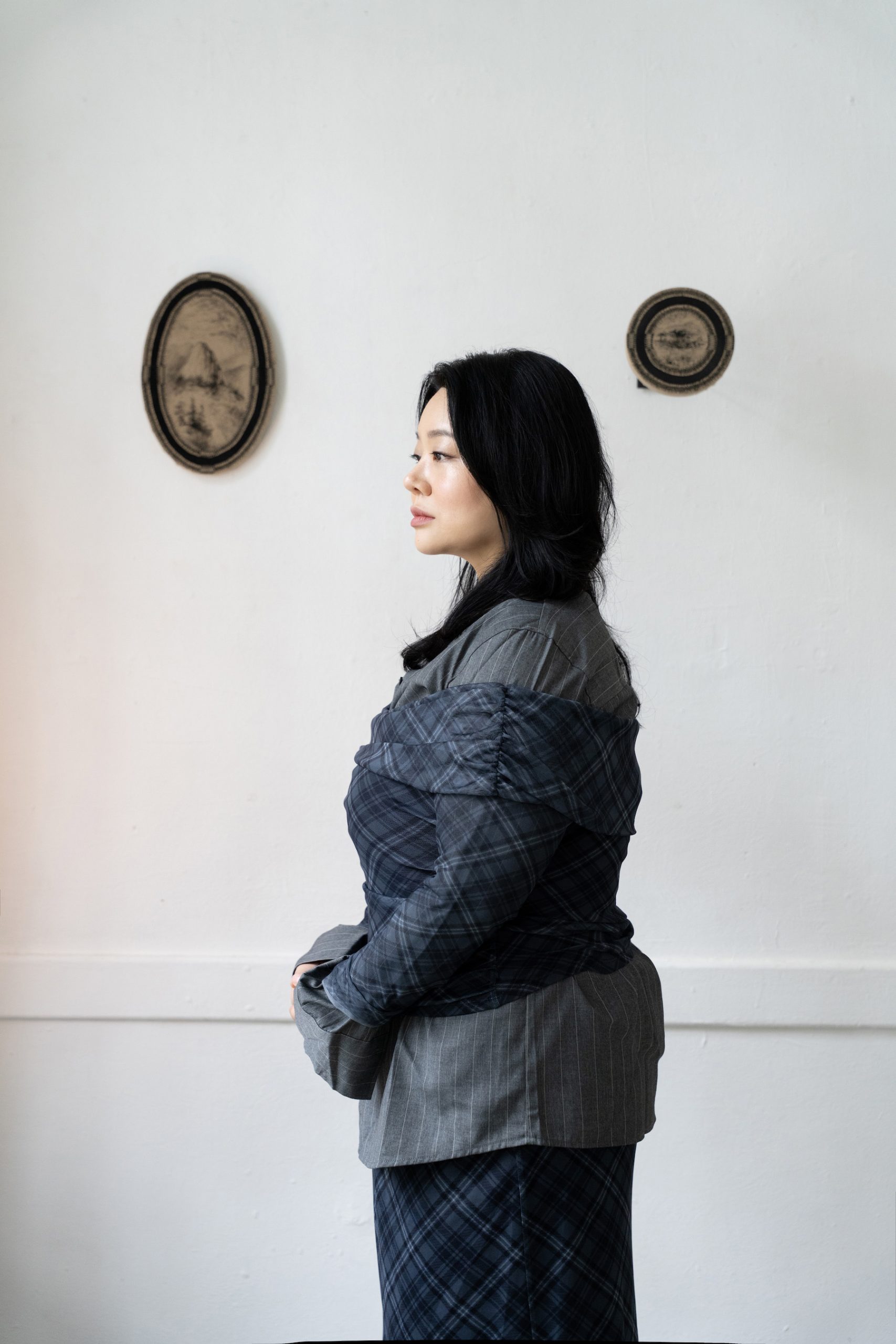 Chung is interested in how landscapes carry memory, becoming both personal and collective spaces. Her works are not depictions of a single view but layered fields where fragments of experience, displacement, and imagination overlap. The material presence of ink, thread, and textile suggests time and touch, while her use of optical tension and abstraction unsettles what first appears familiar.