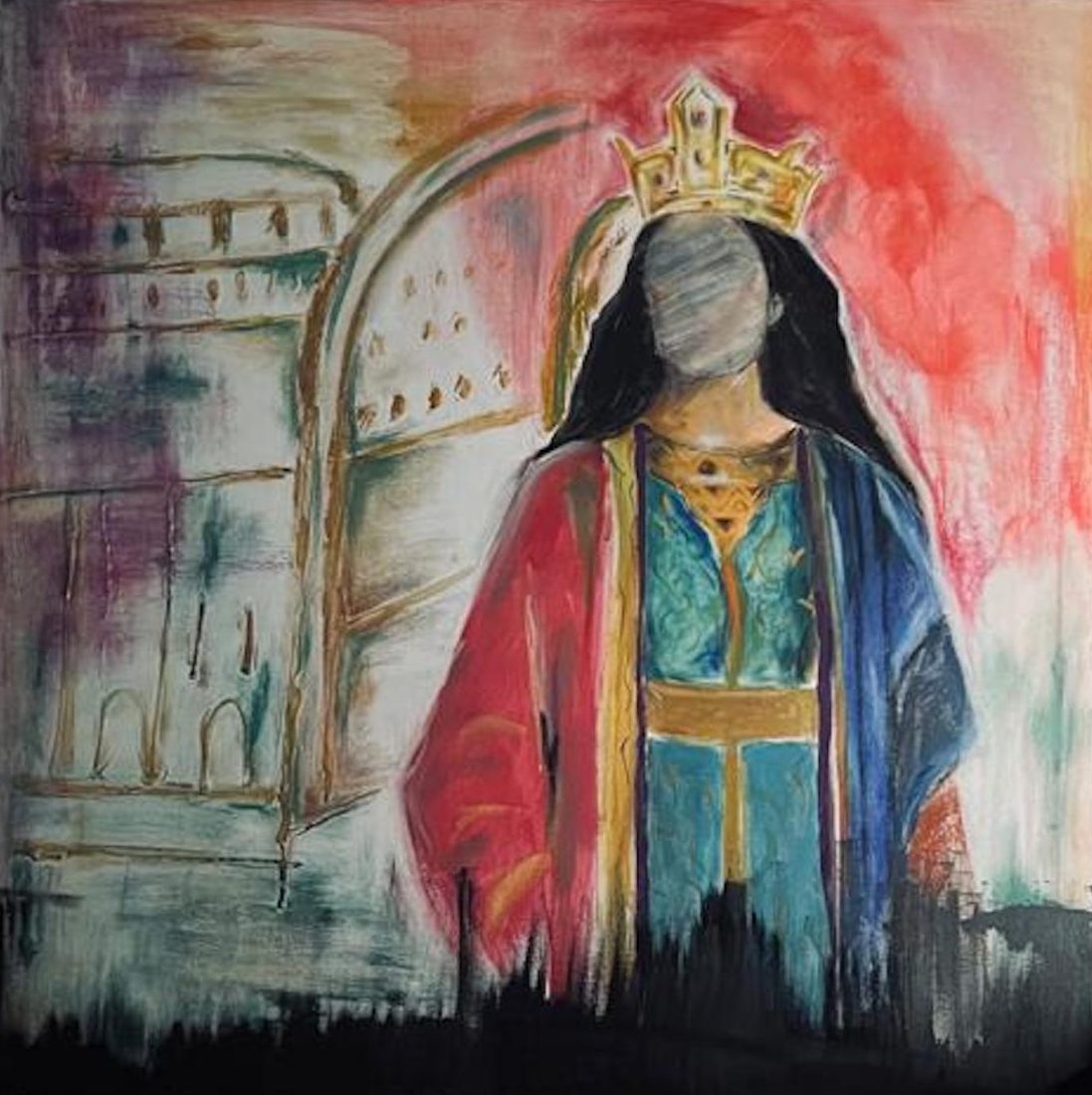The painting depicts the first woman ruler of Iran in the Sassanid dynasty. Her blurred face reflects the fading grandeur of women’s past glory.
