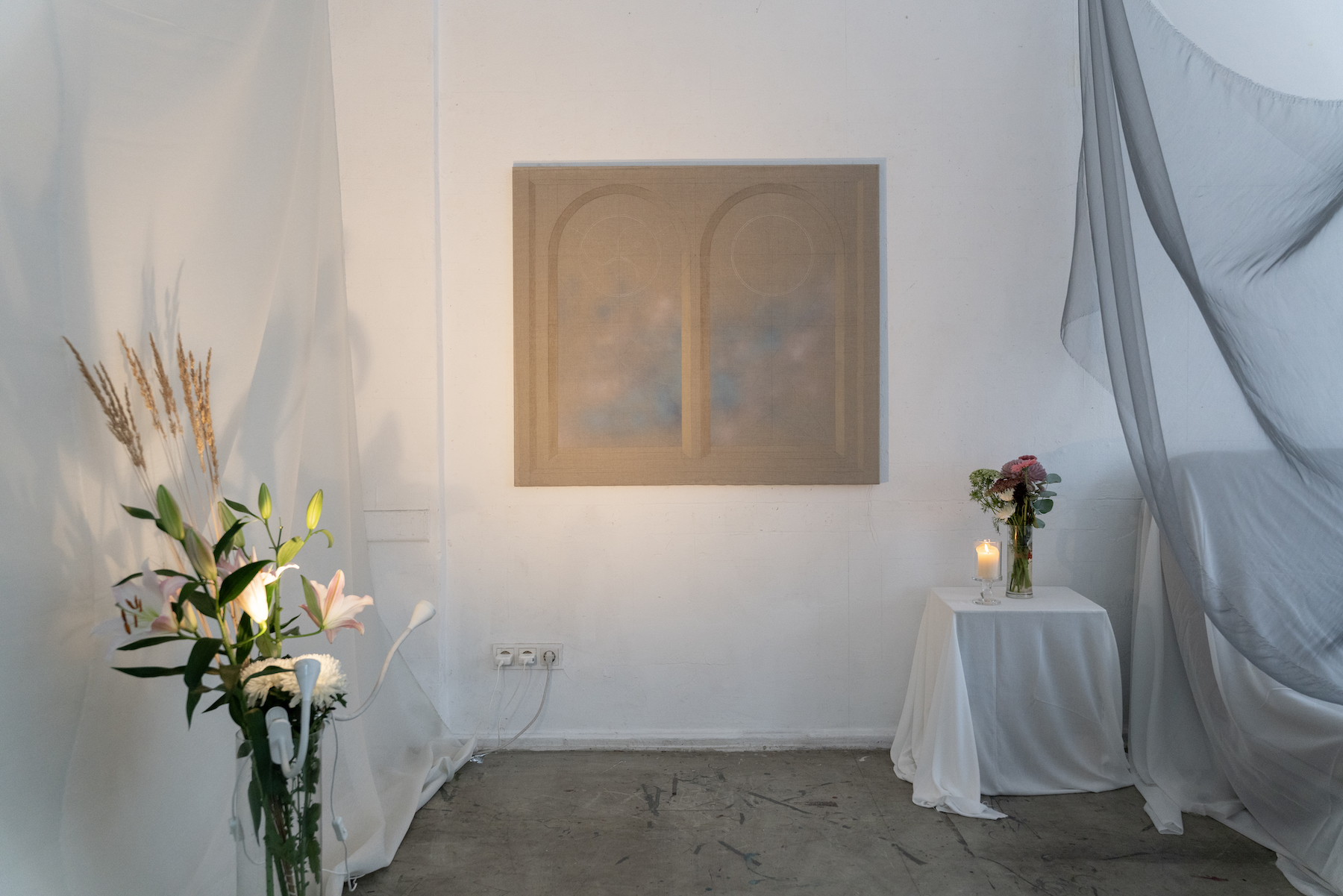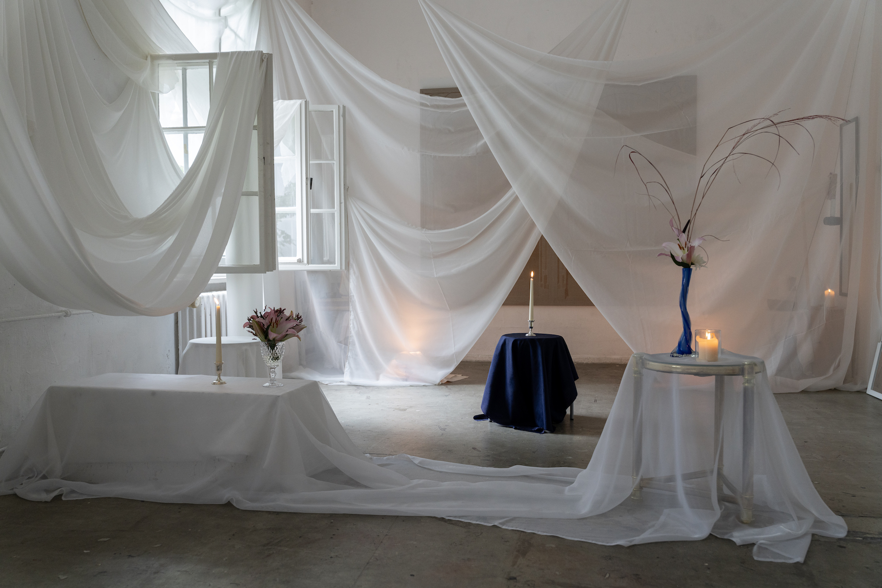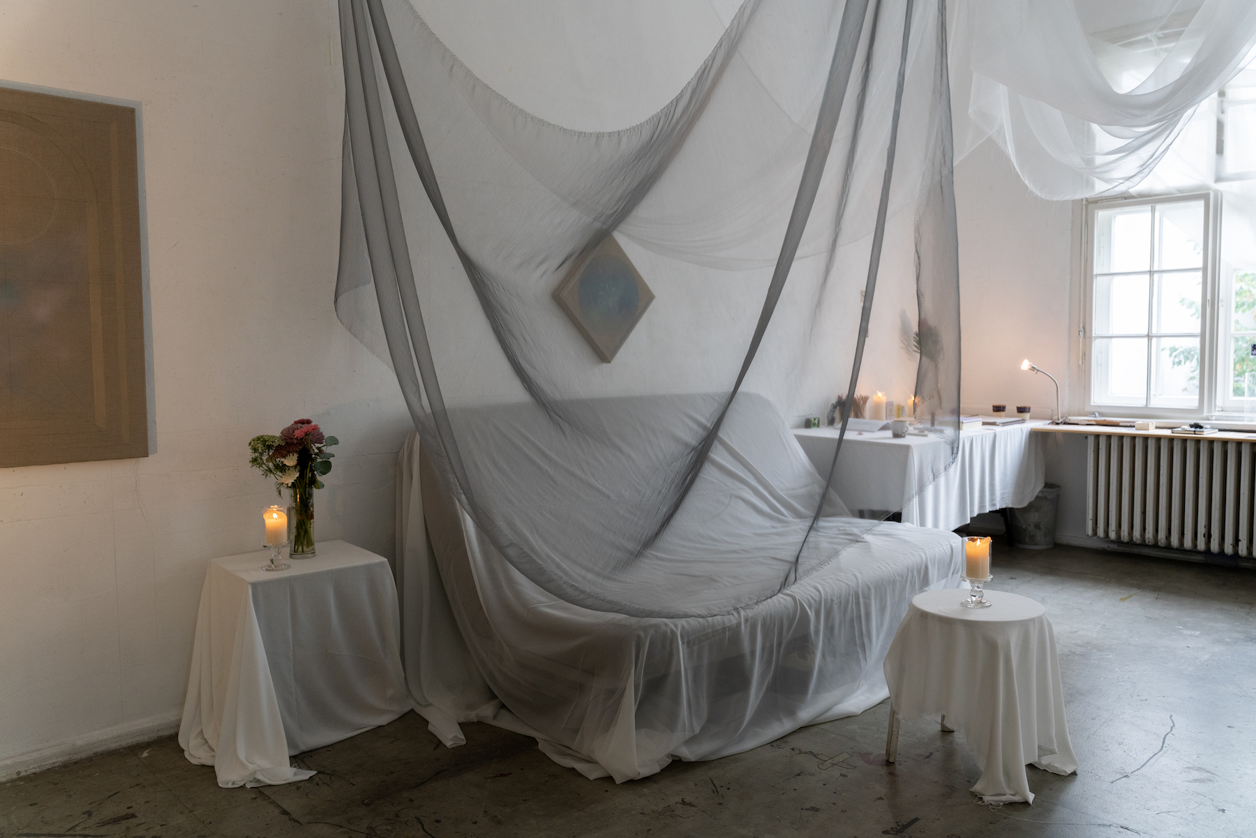 At GlogauAIR, she is developing a new body of work that uses fabric as a metaphor for the materiality of longing. She is interested in the gesture of waiting and thinks of her spatial intervention as building “the ideal environment for the act of painting.” By draping, floating, and suspending white cloth throughout the space, she constructs a composition that becomes kinetic through the activation of light, atmosphere and time.