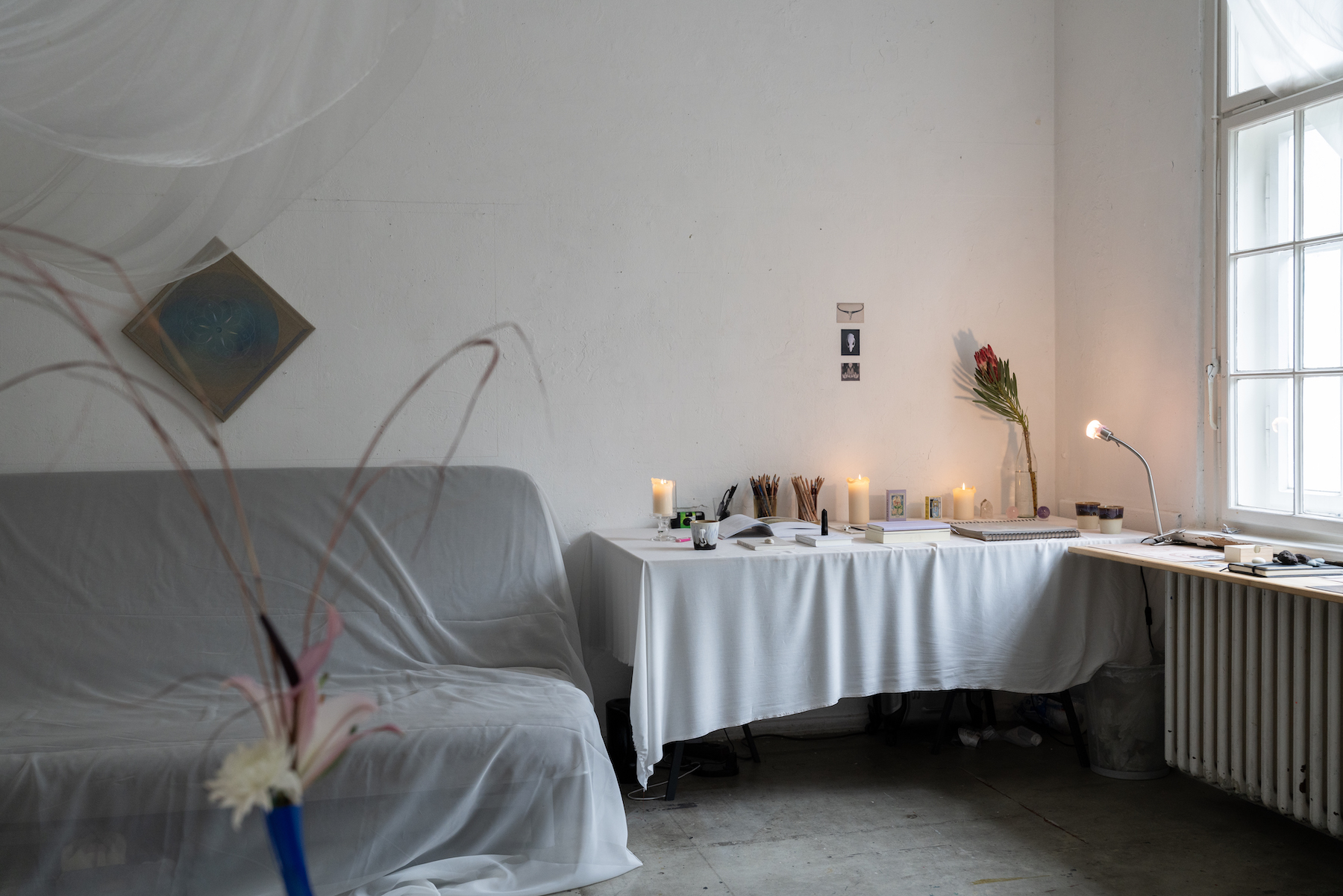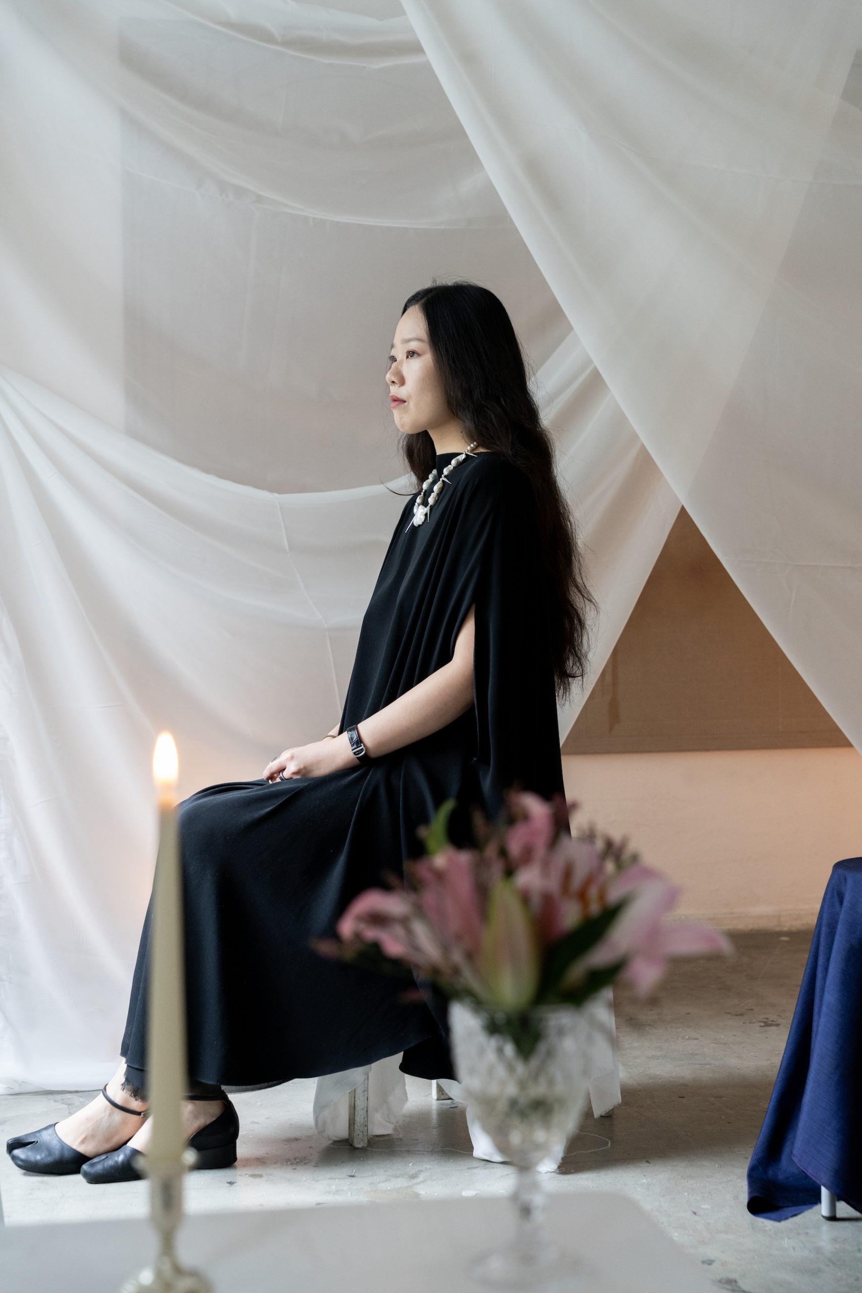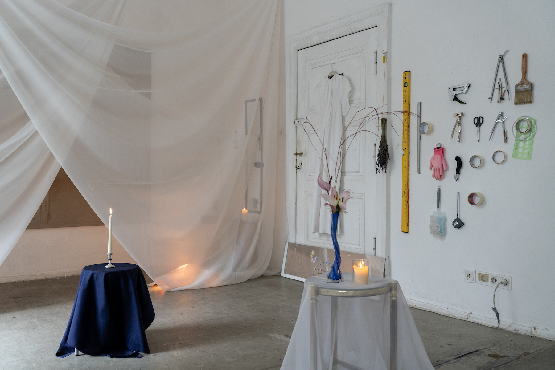 At GlogauAIR, she is developing a new body of work that uses fabric as a metaphor for the materiality of longing. She is interested in the gesture of waiting and thinks of her spatial intervention as building “the ideal environment for the act of painting.” By draping, floating, and suspending white cloth throughout the space, she constructs a composition that becomes kinetic through the activation of light, atmosphere and time.
